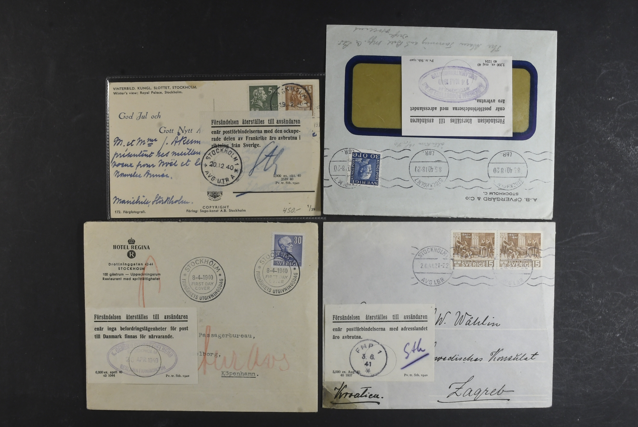 Sweden. Cover, 'Försändelsen återställes till avsändaren ...', labels used on covers seemingly sent towards Denmark, France, Holland and Croatia, respectively. (4).