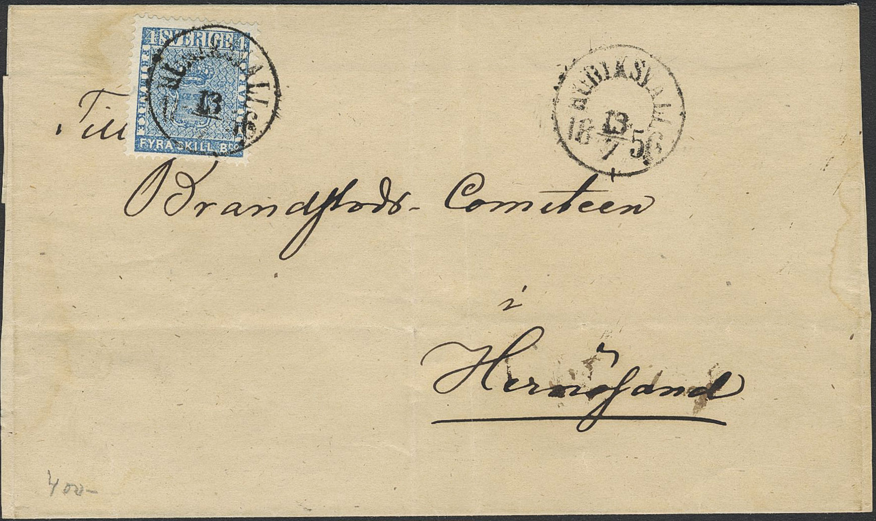 Sweden. Facit 2 on cover, 4 skill on beautiful cover sent from HUDIKSVALL 13.7.1856 to Hernösand. Black seal on the reverse.