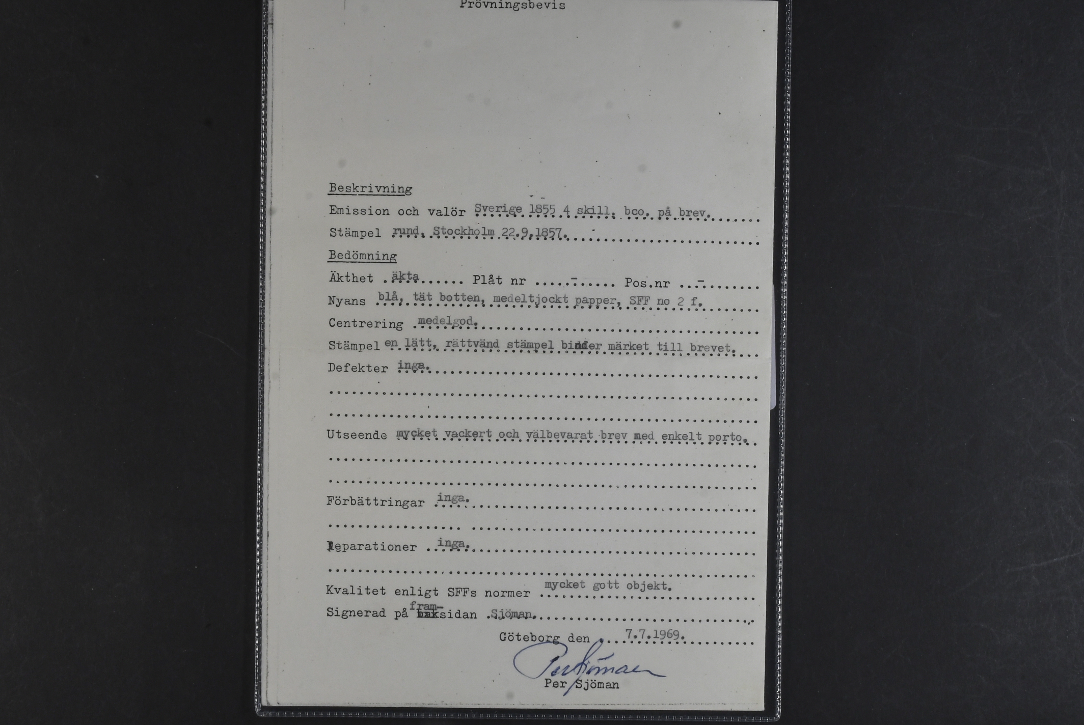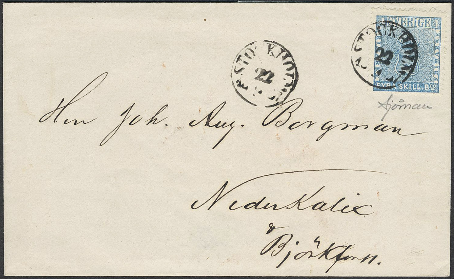 Sweden. Facit 2f on cover, 4 skill on very fine cover sent from STOCKHOLM 22.9.1857 to Nederkalix. Certificate Sjöman (1969).