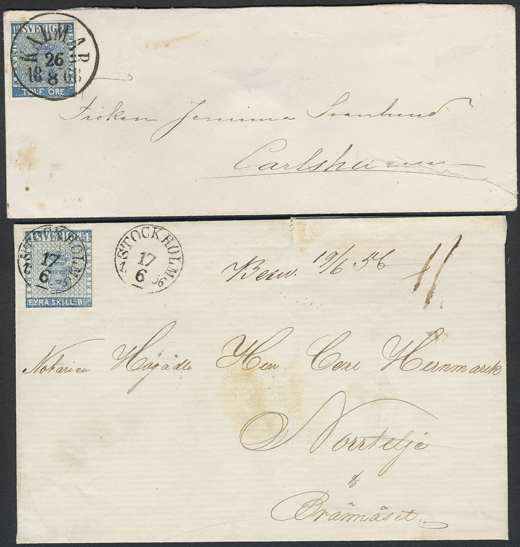 Sweden. Facit 2v, 9v on cover, 4 skill with cut perforation ('lille-put') on cover sent from STOCKHOLM 17.6.1856 to Norrtelje. Also and ditto with 12 öre C-o-A sent from Karlstad to Karlshamn. (2).