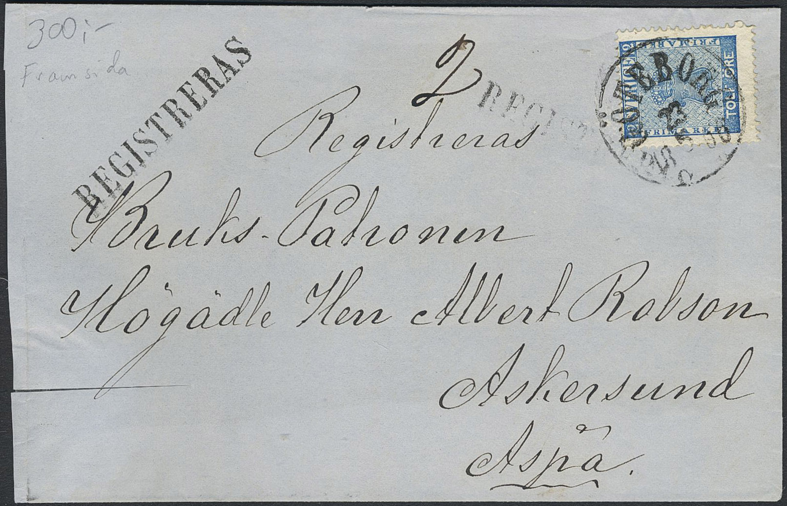 Sweden. Facit 9c2 on cover, 12 öre on cover front (cut at bottom left) sent from GÖTEBORG 23.5.1866, with the special mark REGISTRERAS (recording) (type 2, P: 1500), to Askersund.
