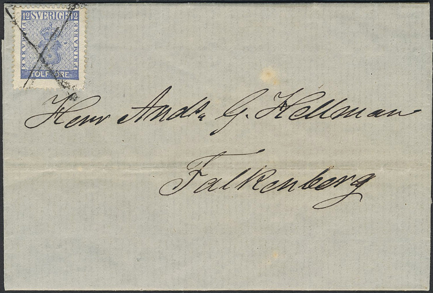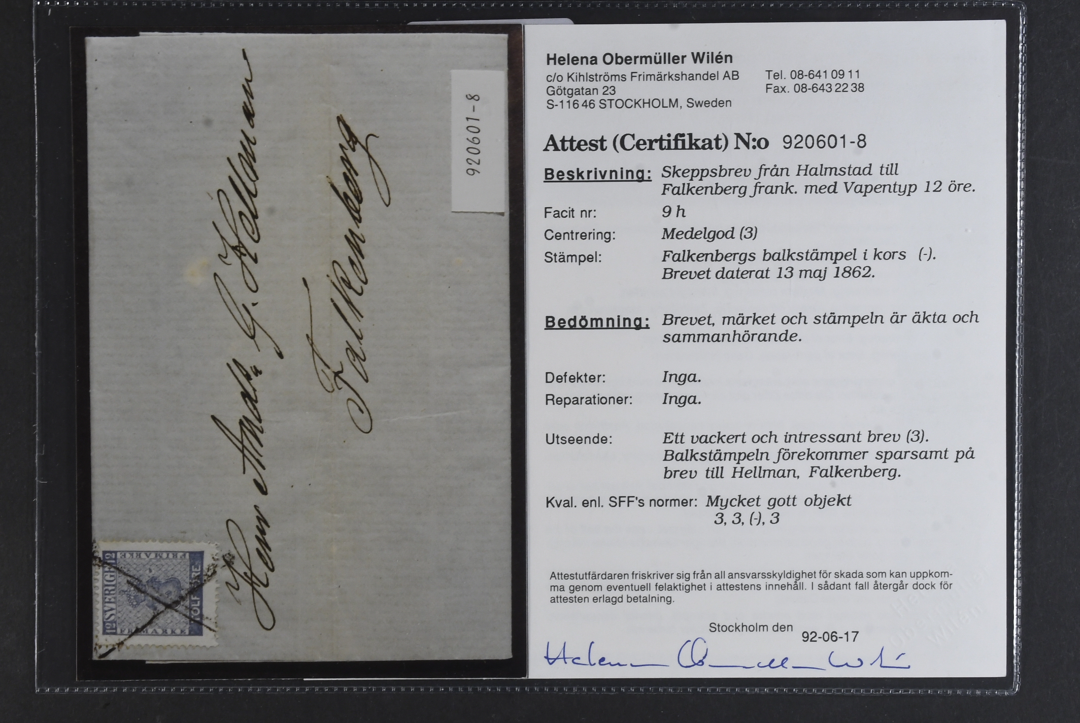 Sweden. Facit 9h1 on cover, 12 öre bright ultramarine. Nice cover sent from 'Halmstad den 13 Mai 1862' to Falkenberg cancelled with the special bar mark upon arrival. Certificate HOW 3, 3, (-), 3 (1992). SEK 6000