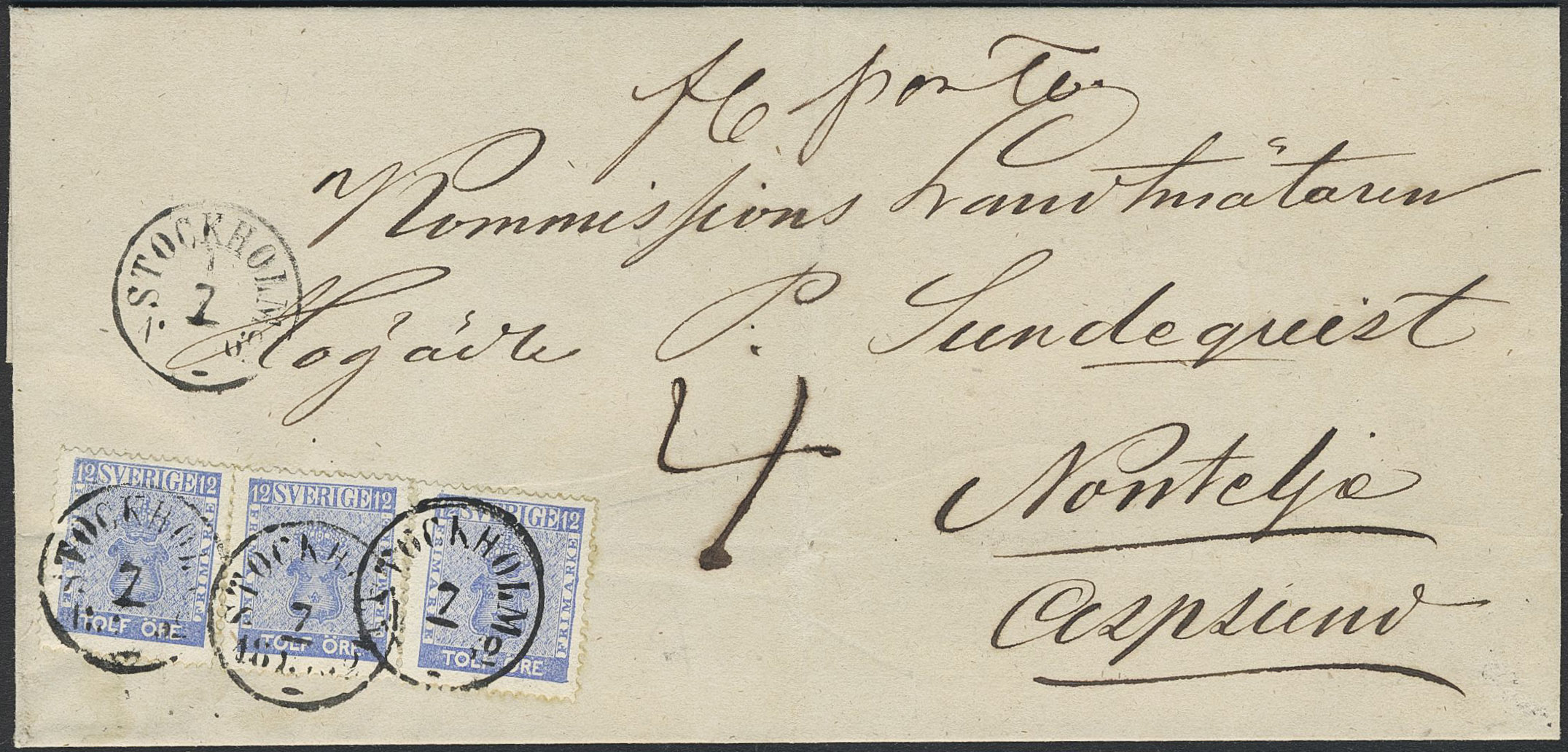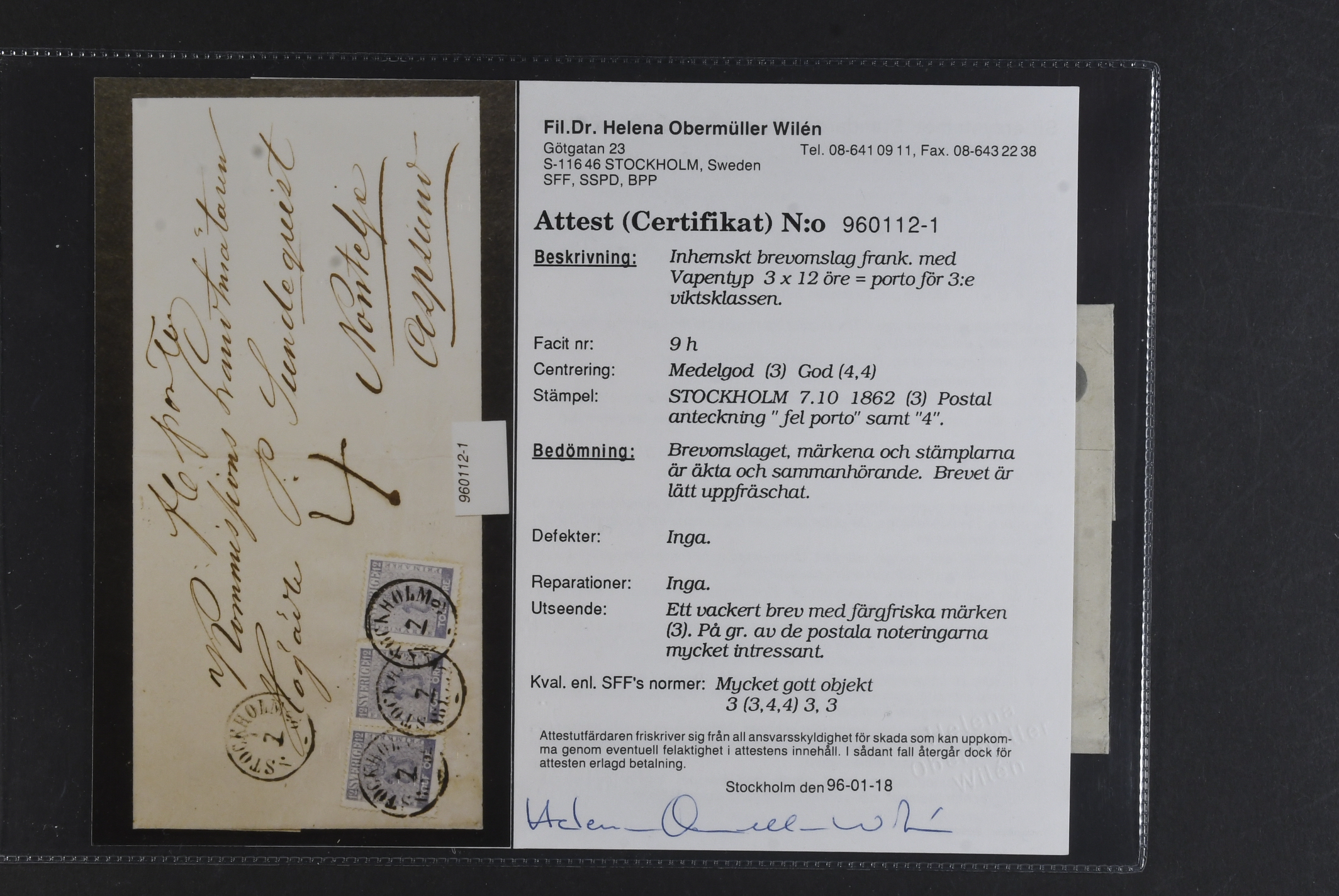 Sweden. Facit 9h1 on cover, 3×12 öre bright ultramarine on insufficiently prepaid cover from STOCKHOLM 7.10.1862 to Norrtelje. Notations '4' and 'fel porto'. Lightly cleaned. Certificate HOW 3 (3,4,4) 3, 3 (1996). Nice item.