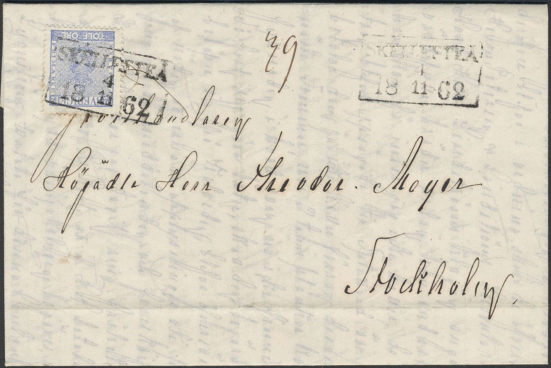 Sweden. Facit 9i on cover, 12 öre dull ultramarine. Vey beautiful cover sent from SKELLEFTEÅ 4.11.1862 to Stockholm.