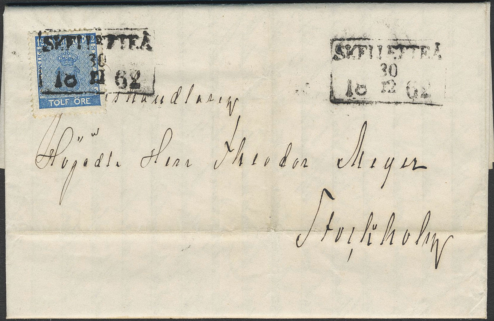 Sweden. Facit 9l on cover, 12 öre blue, dense background. Vey beautiful cover sent from SKELLEFTEÅ 30.11.1862 to Stockholm.