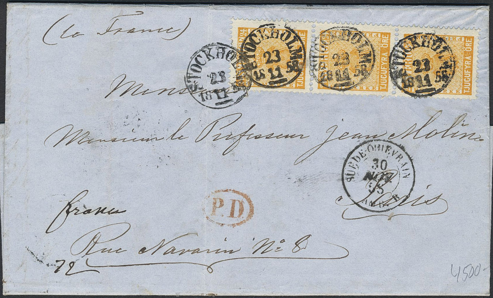 Sweden. Facit 10 on cover, 3×24 öre (strip of three) on cover sent from STOCKHOLM 23.11.1858 via K.S.&N.P.A. HAMBURG 28.11.1858 to France.