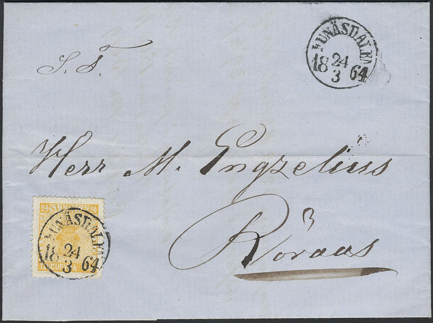 Sweden. Facit 10 on cover, 24 öre on cover sent from FUNÄSDALEN 24.3.1864 to Norway. Short corner perf still very beautiful.