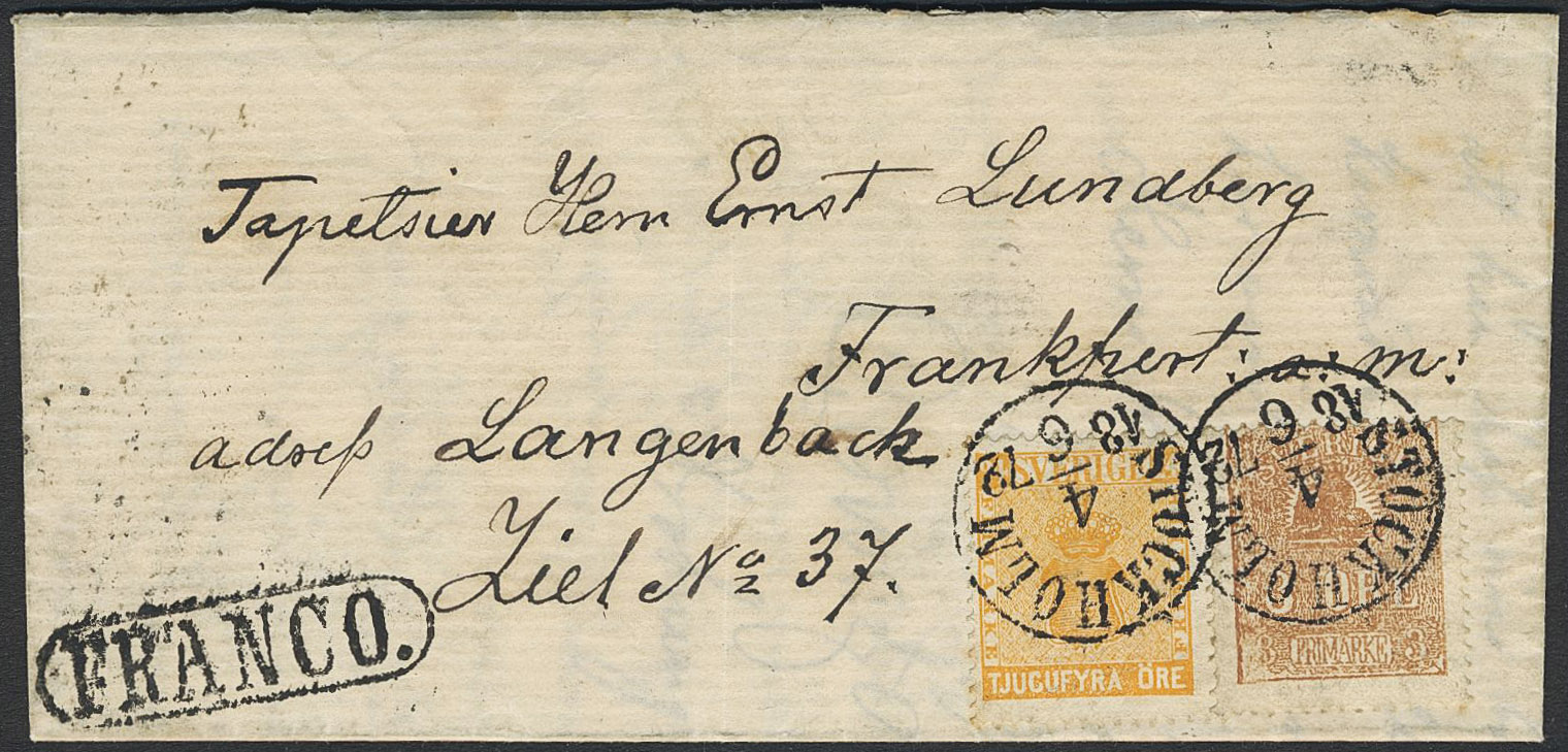 Sweden. Facit 10, 14B on cover, 3+24 öre on cover sent from STOCKHOLM 4.6.1872 to Germany, with arrival pmk FRANKFURT A.M. 8.6.1872.