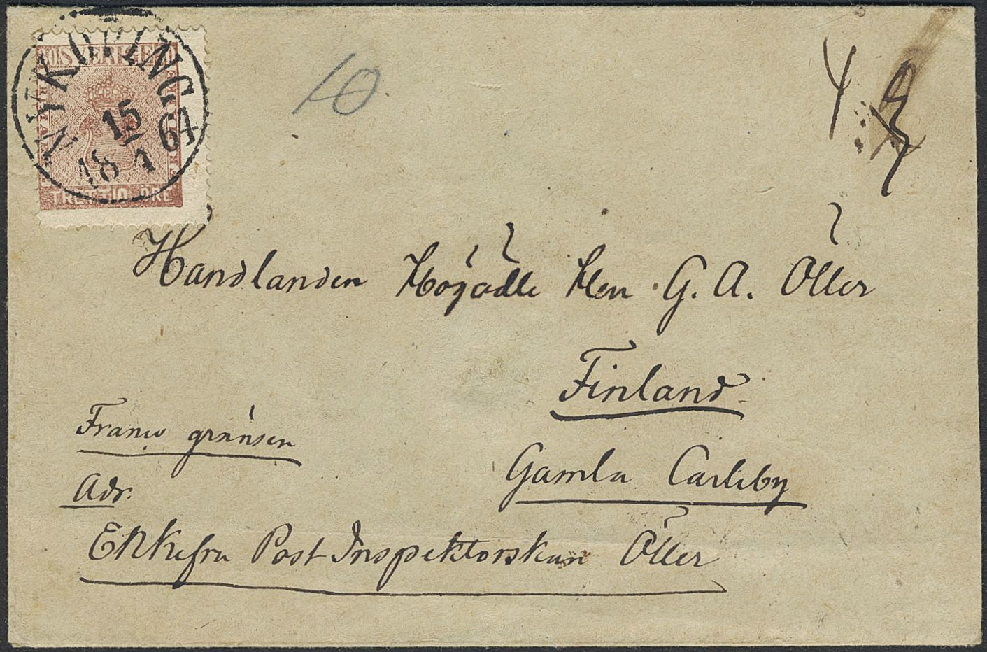 Sweden. Facit 11 on cover, 30 öre on beautiful cover prepaid to the border, sent from NYKÖPING 15.4.1864 via STOCKHOLM 15.APR.64 to Finland. SEK 2000