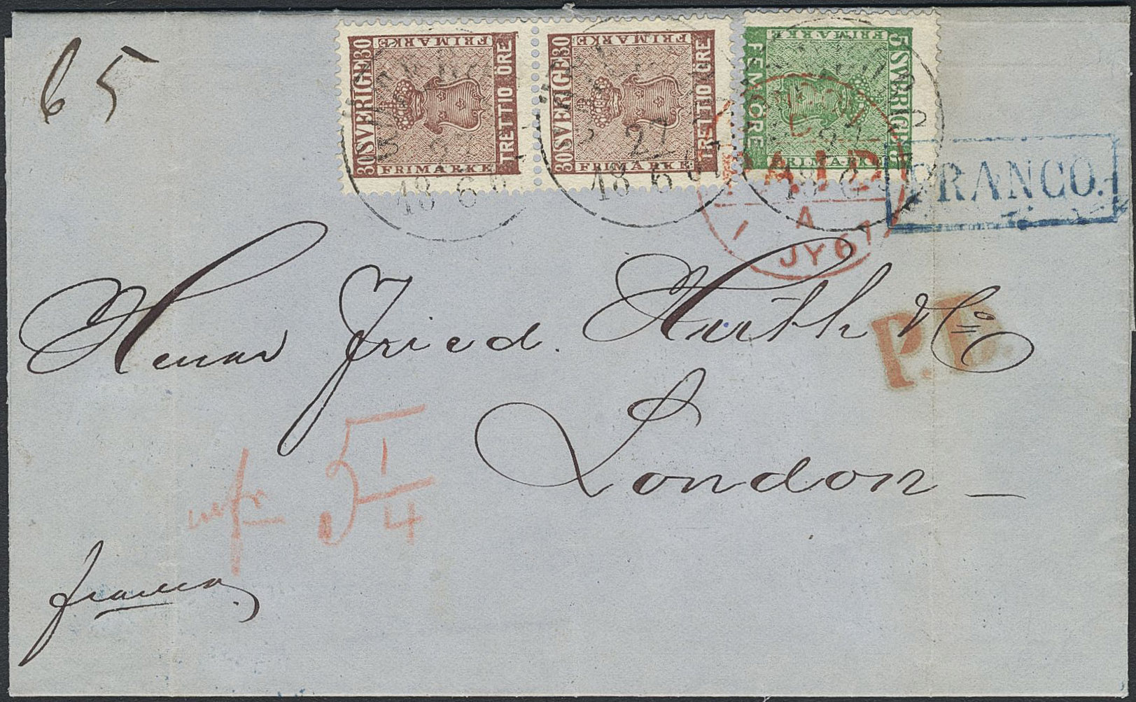Sweden. Facit 11, 7 on cover, 5+2×30 öre on cover sent from GÖTEBORG 27.6.1867 to Great Britain with arrival pmk LONDON PAID 1.JY.67.