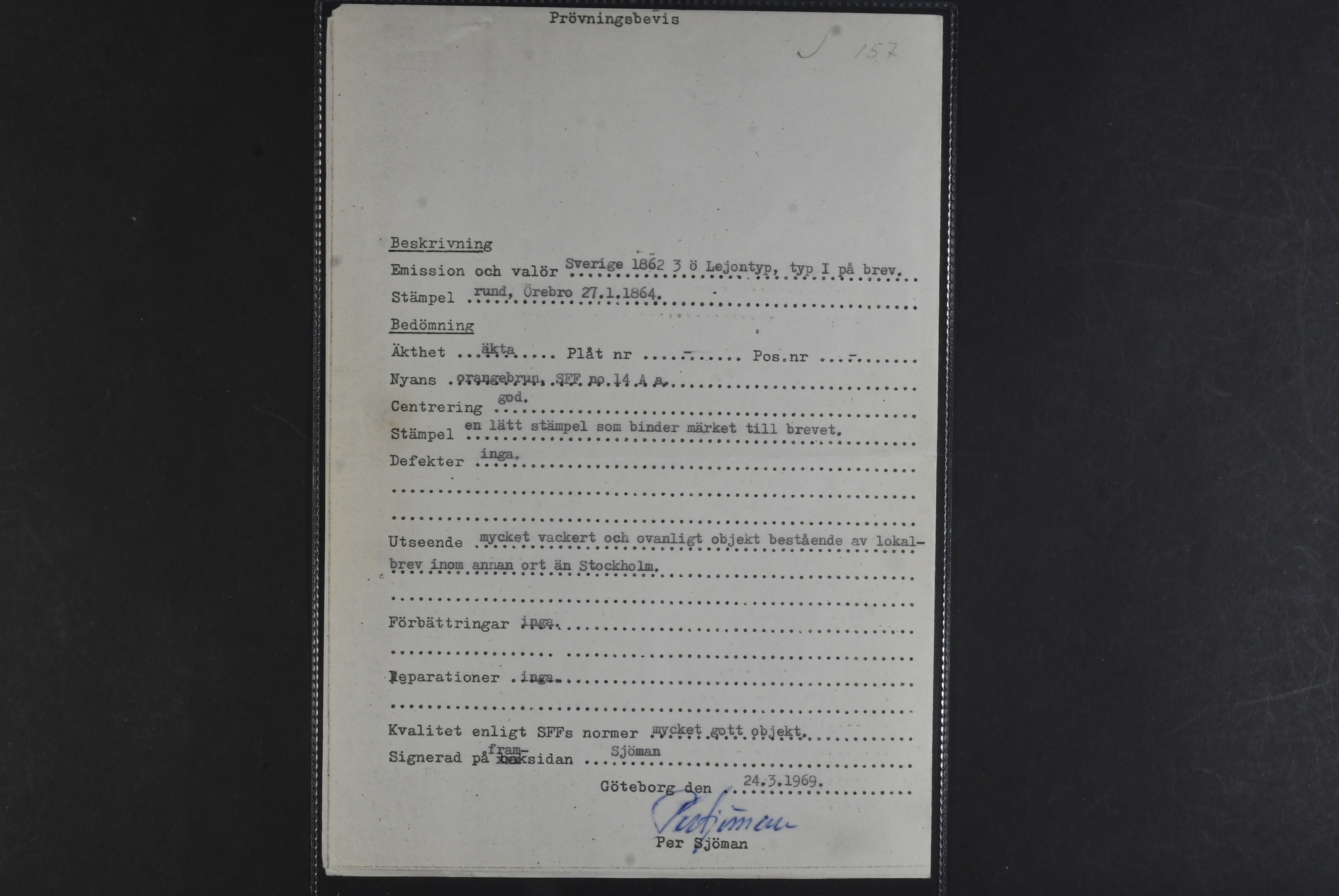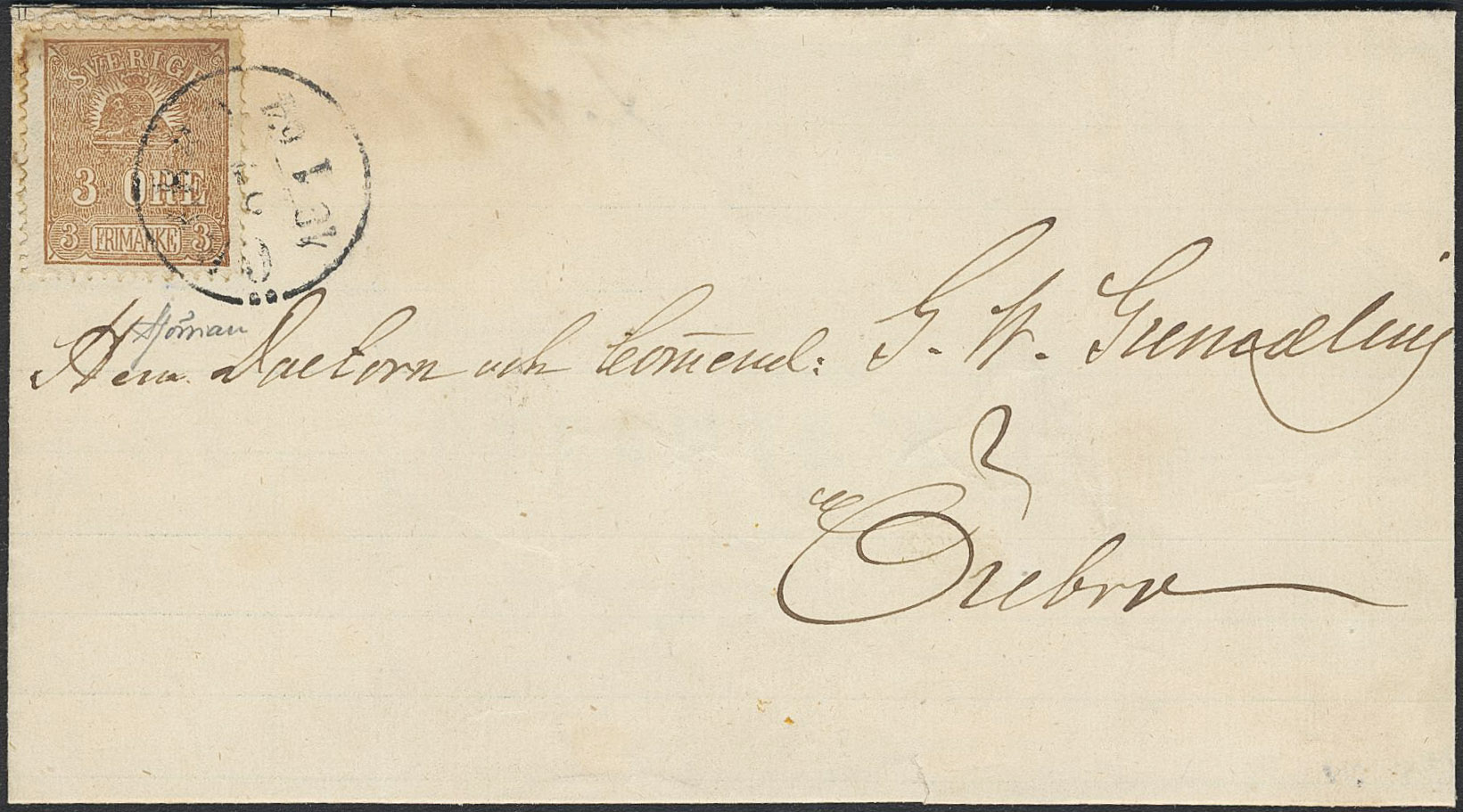 Sweden. Facit 14A on cover, 3 öre brown, type I. Local cover cancelled ÖREBRO 27.1.1864. Certificate Sjöman Very fine (1969). SEK 6000