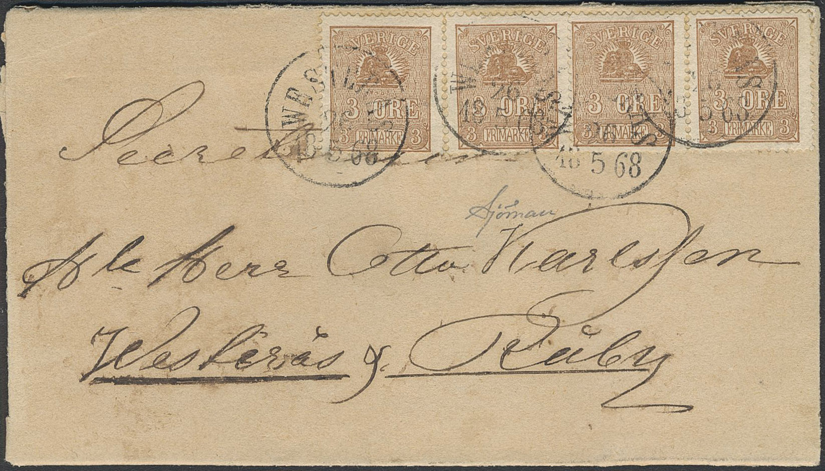 Sweden. Facit 14B on cover, 4×3 öre (two pairs) on beautiful cover sent from WESTERÅS 26.5.1868 to Råby.