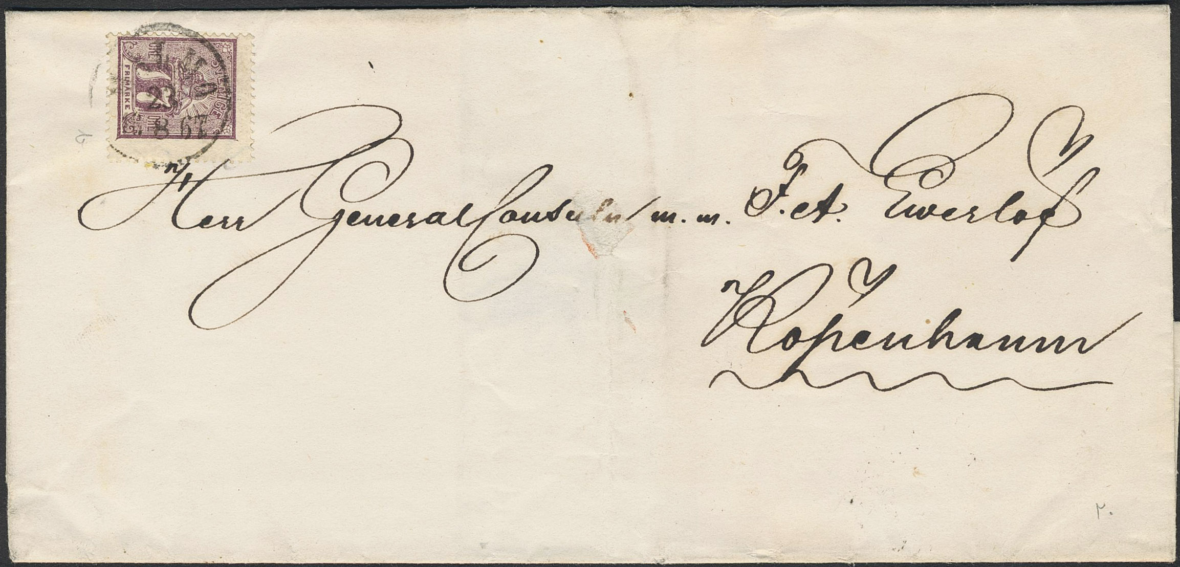 Sweden. Facit 15b2 on cover, 17 öre reddish-bluish lilac, perforation of 1865. Cover sent from MALMÖ 23.8.1867 to Denmark with arrival pmk KIØBENHAVN 24.8. SEK 5000