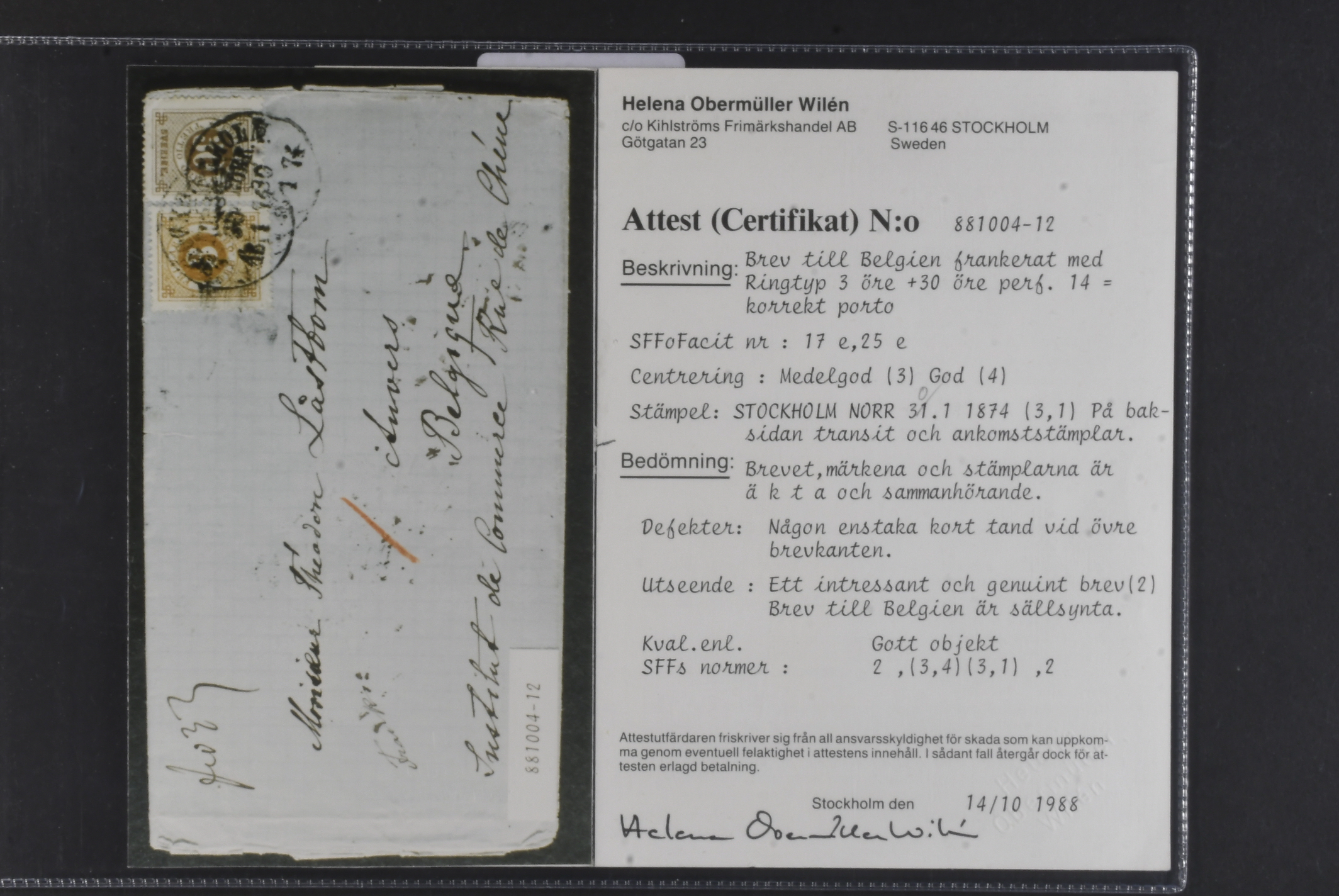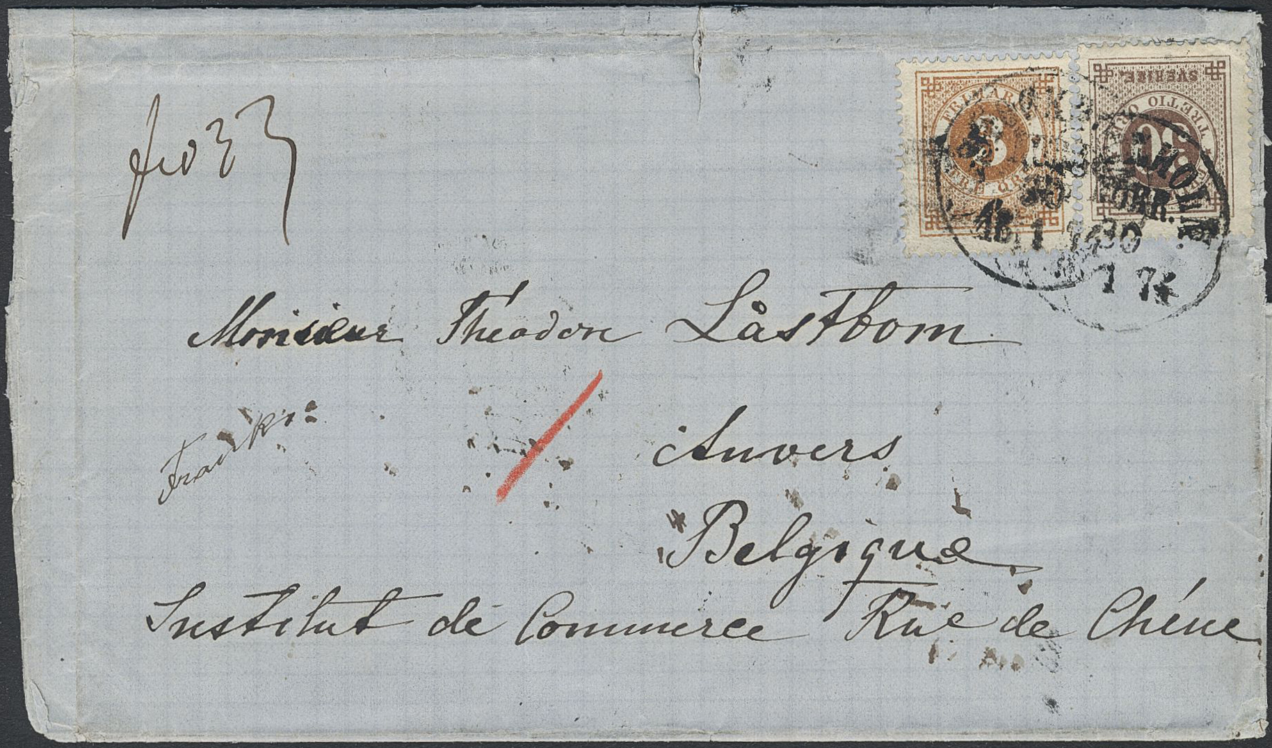 Sweden. Facit 17e, 25e on cover, 3+30 öre on fine cover sent pre-GPU from STOCKHOLM NORR 30.1.1874 to Belgium. Scarce rate. Certificate HOW 2, (3,4) (3,1), 2 (1988). SEK 15000