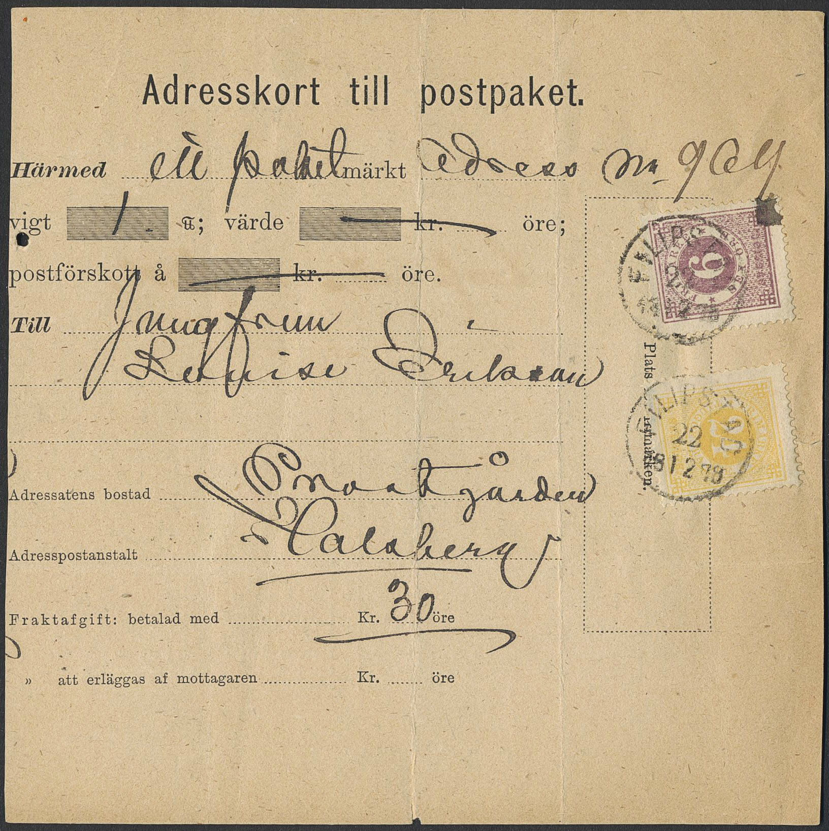 Sweden. Facit 20, 24 on cover, 6+24 öre on address card for parcel sent from FILIPSTAD 22.12.1878.