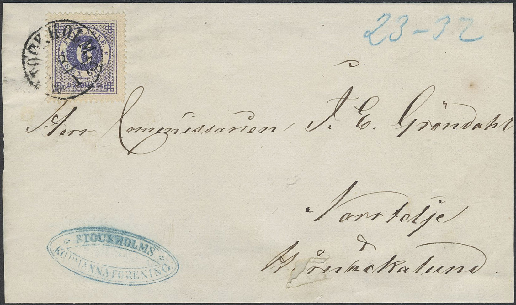 Sweden. Facit 20b on cover, 6 öre ultramarine-violet on yellowish paper. Printed matter sent from STOCKHOLM 8.1.1873 to Norrtelje. The cover with small paper damage, still beautiful. Opinion (shade) by Erich Harbrecht (1990).