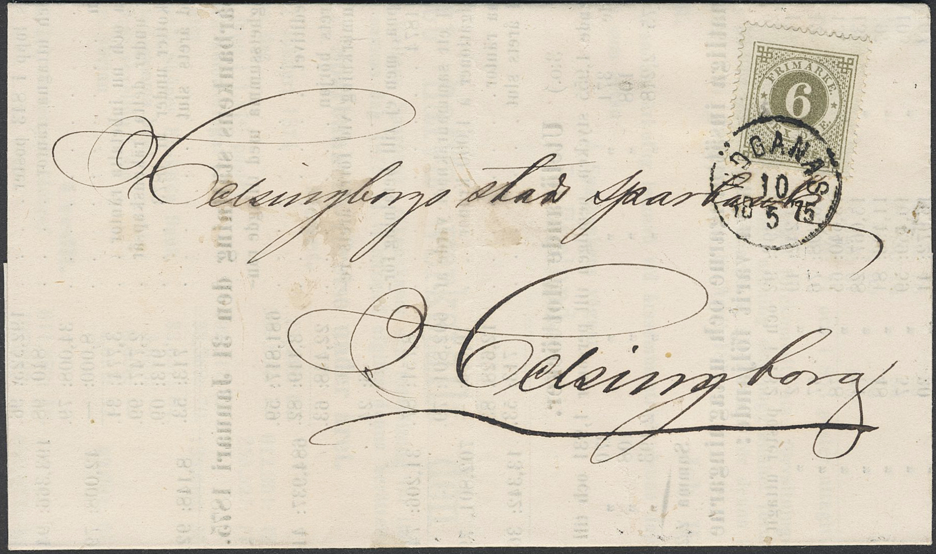Sweden. Facit 20f on cover, 6 öre brownish olive-grey on beautiful printed matter sent from HÖGANÄS 10.5.1875 to Helsingborg.