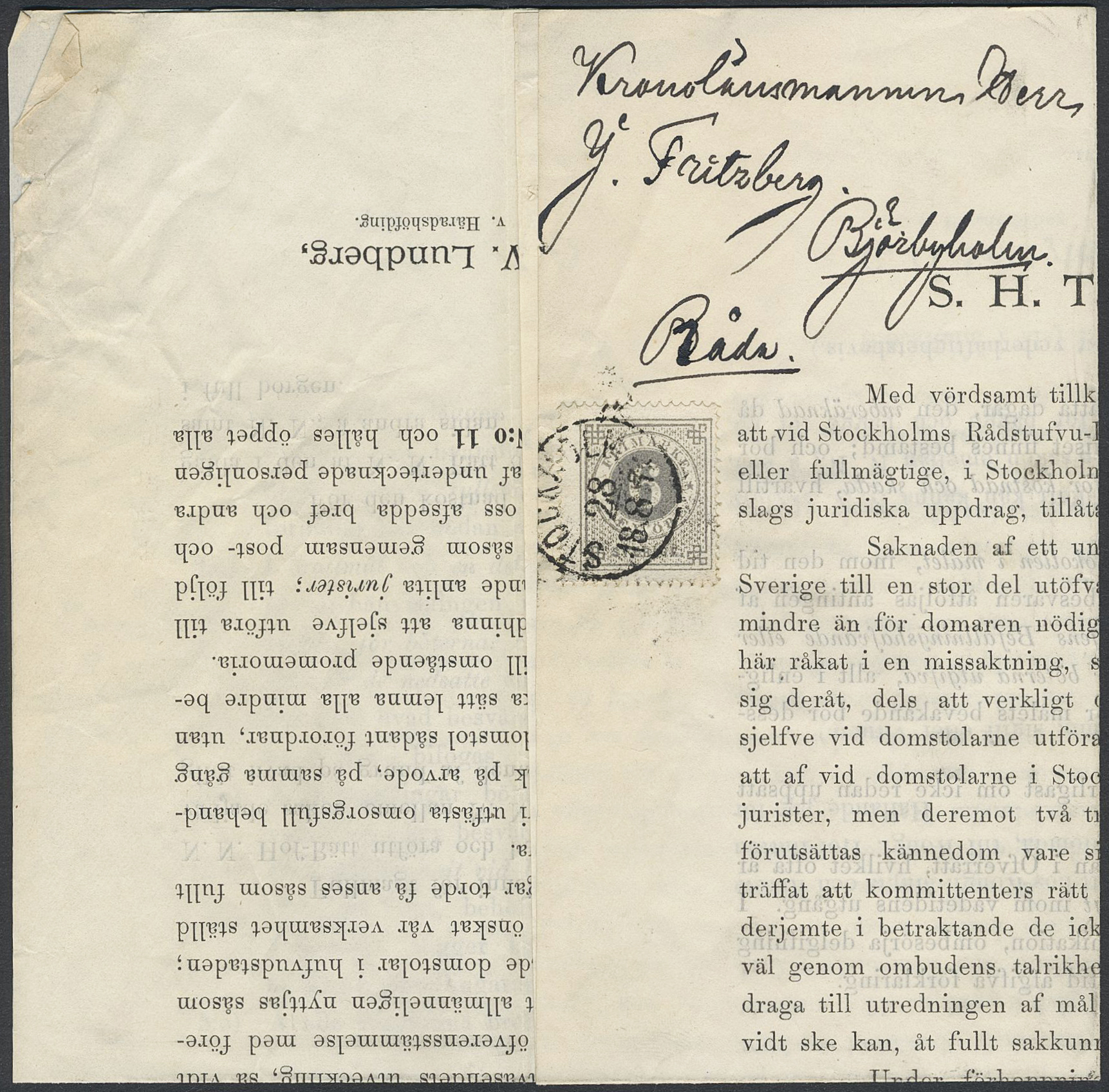 Sweden. Facit 20g on cover, 6 öre olive-grey on beautiful printed matter sent from STOCKHOLM 28.8.1874 to Råda.