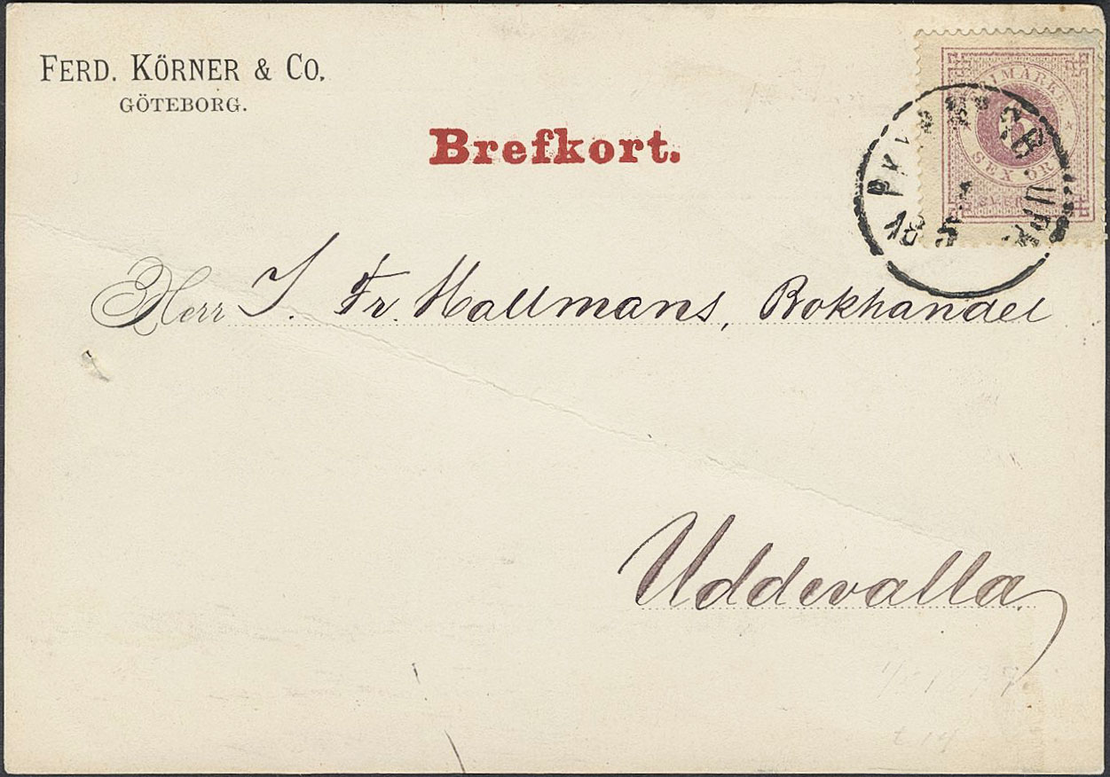 Sweden. Facit 20k on cover, 6 öre red-lilac. Unusually early postcard, sent from 'Göteborg den 1 Maj 1877' to Uddevalla. Privately manufactured postcards were not allowed domestically until 1.1.1877. Tiny pin hole. Few recorded with perf. 14.