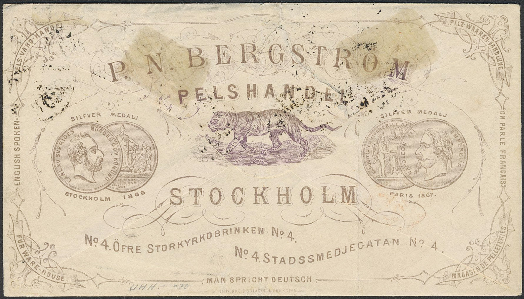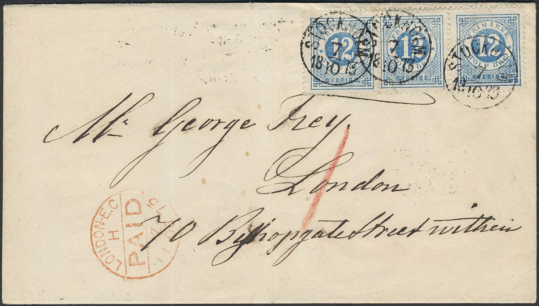 Sweden. Facit 21 on cover, 3×12 öre (strip of three) on beautiful cover sent from STOCKHOLM 7.10.1873 to Great Britain with arrival pmk LONDON E C PAID 11.OC.73. On the reverse fantastic beautiful advertisment.