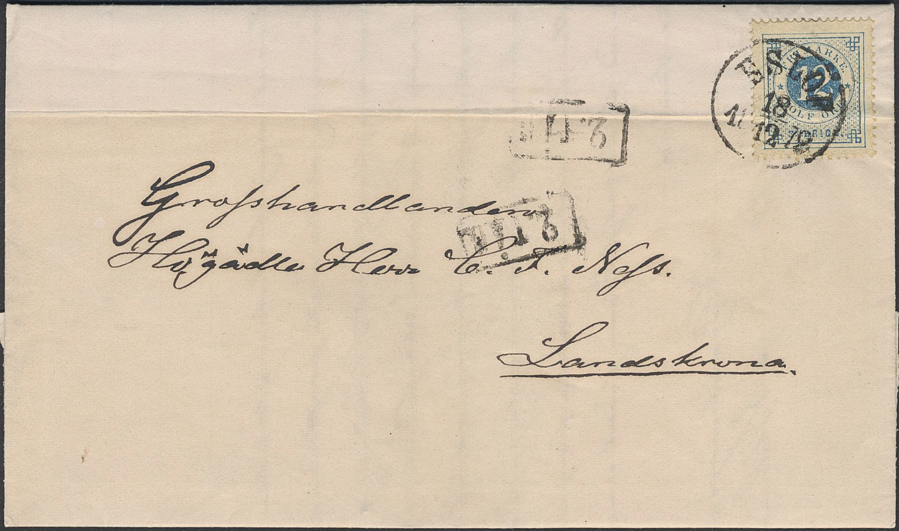 Sweden. Facit 21 on cover, 12 öre on cover cancelled ESLÖF and 2.TÅG, sent to Landskrona. Light crease through the stamp, nevertheless very beautiful.