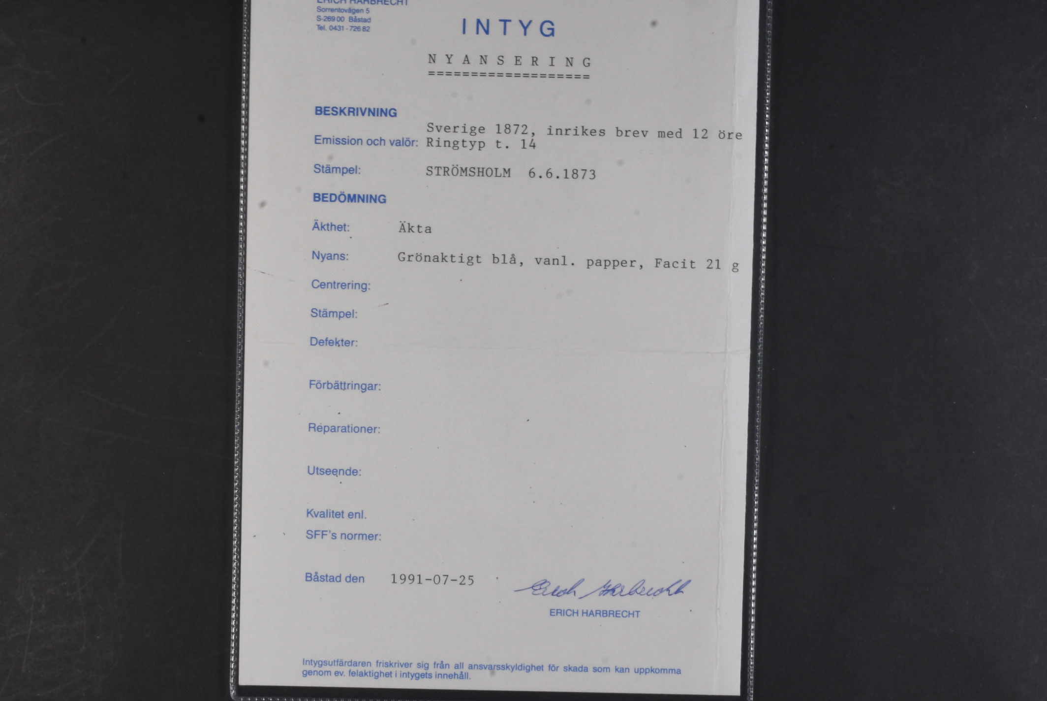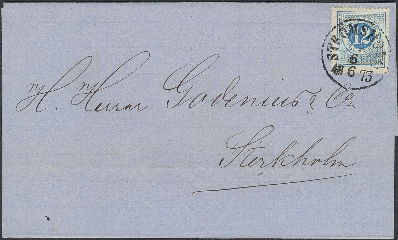 Sweden. Facit 21g on cover, 12 öre greenish blue on ordinary paper on cover sent from STRÖMSHOLM 6.6.1873 to Stockholm. Superb. Opinion (shade) by Erich Harbrecht.