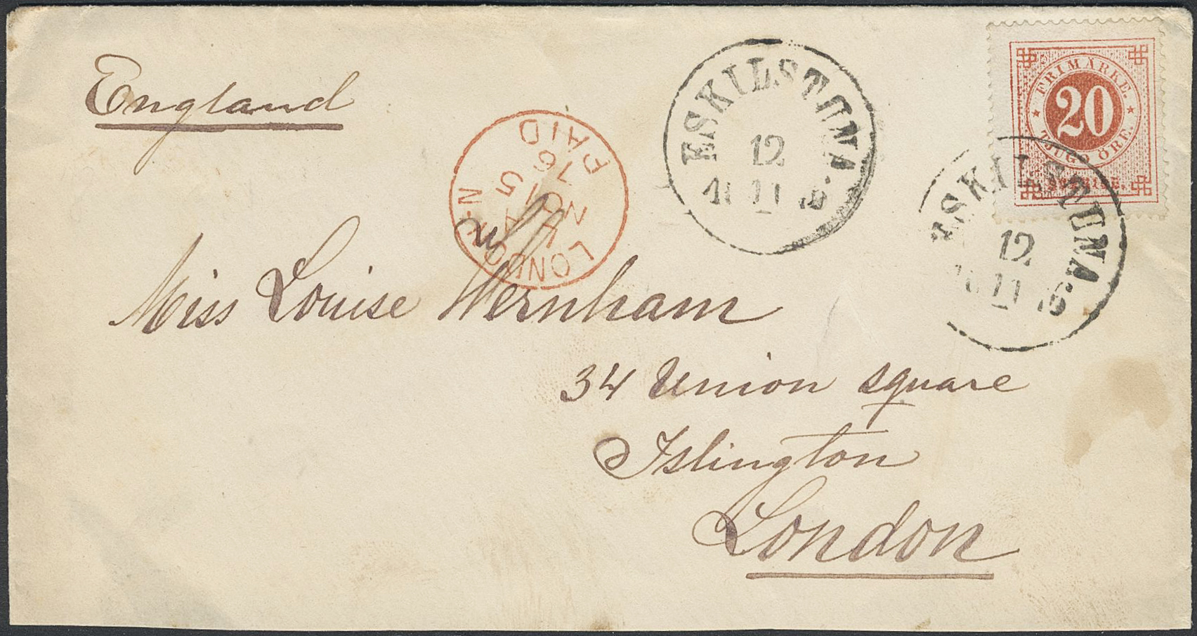 Sweden. Facit 22 on cover, 20 öre on beautiful cover sent from ESKILSTUNA 12.11.1876 to Great Britain, with arrival pmk LONDON PAID 15.NO.76.