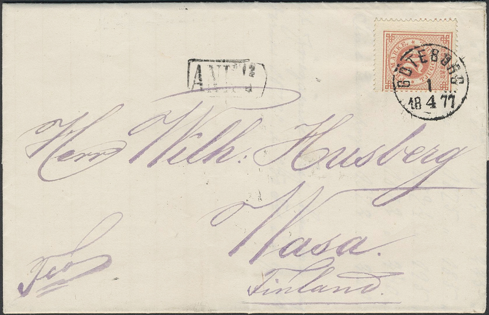 Sweden. Facit 23 on cover, 20/20 öre red, double print. Cover sent from GÖTEBORG 1.4.1877 via STOCKHOLM K.E. 2,4,1877 and Russia to Finland, with arrival pmk ANK 12.4. SEK 3000
