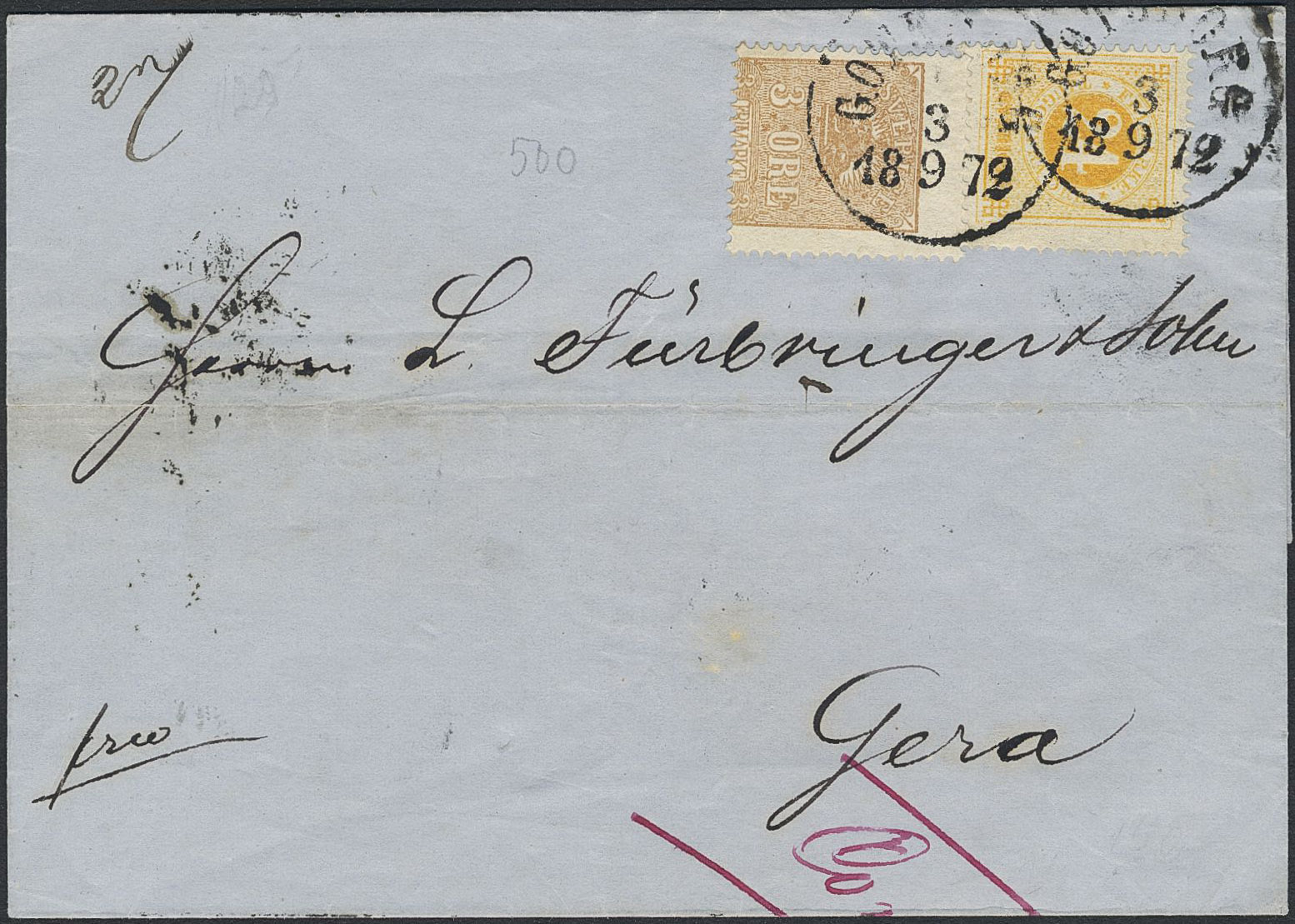 Sweden. Facit 24, 14B on cover, 3+24 öre on cover sent from GÖTEBORG 3.9.1872 to Germany with arrival pmk GERA 6.9.