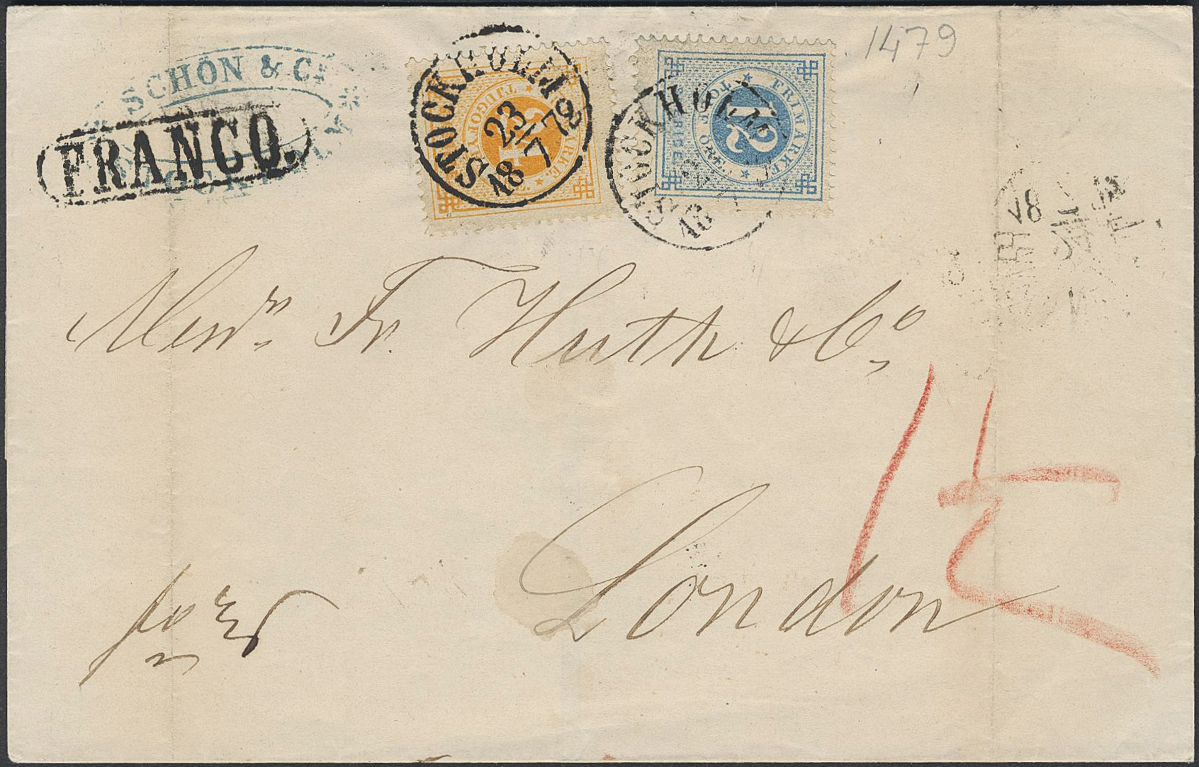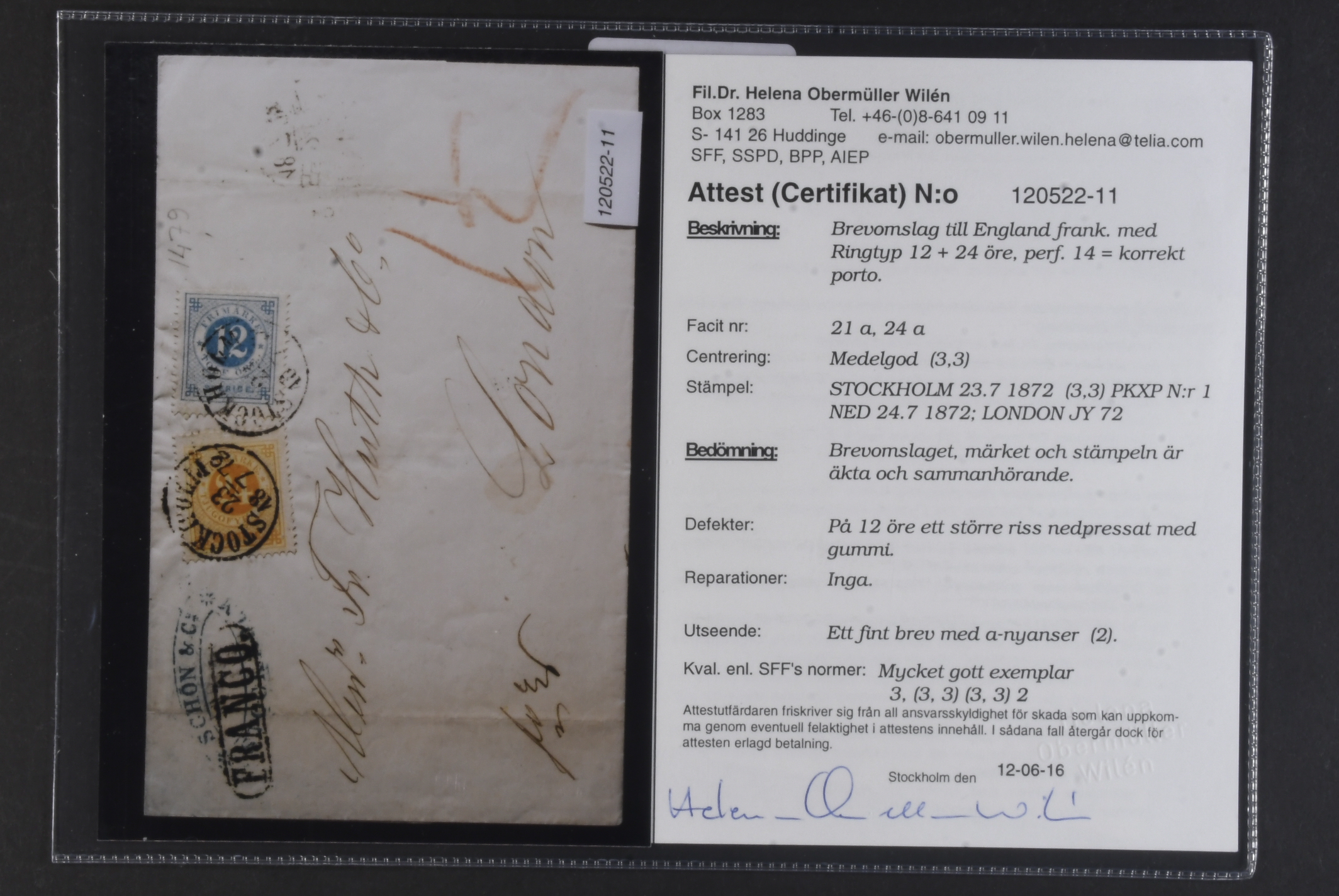 Sweden. Facit 24a, 21a on cover, 12+24 öre on very fine cover sent pre-GPU from STOCKHOLM 23.7.1872 via PKXP Nr 1 NED 24.7.1872 to Great Britain, with arrival pmk LONDON E C 27.JY.72. One stamp with tear. Certificate HOW 3 (3,3) (3,3) 2 (2012).