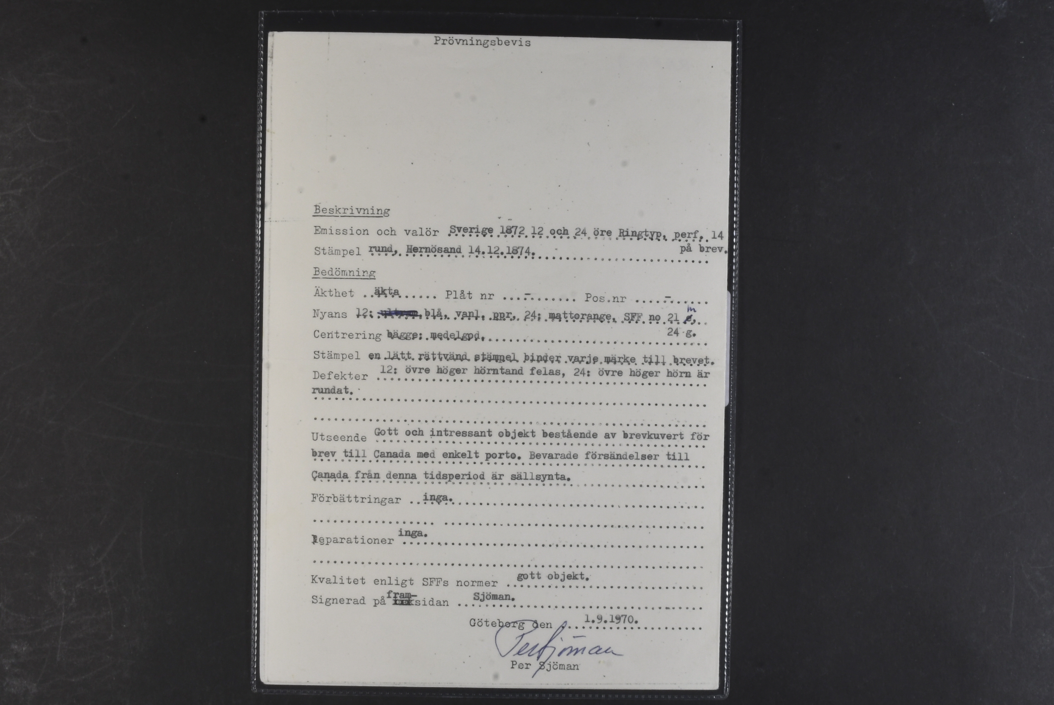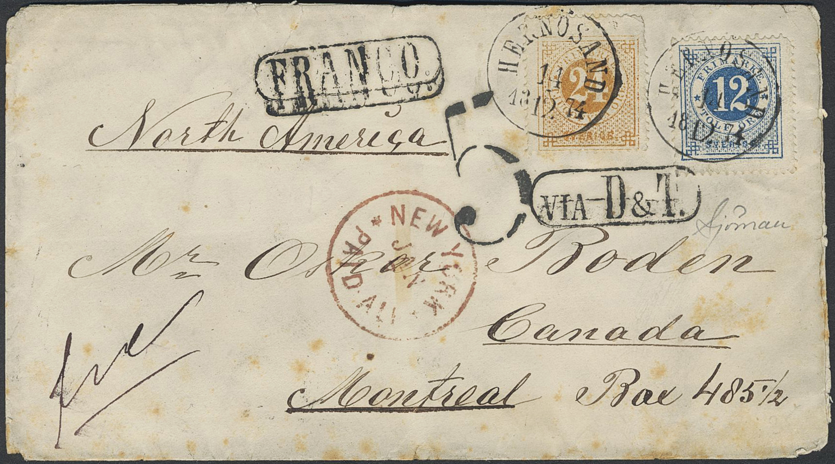 Sweden. Facit 24g, 21m on cover, 12+24 öre on beautiful pre-GPU cover sent from HERNÖSAND 14.12.1874 to Canada, with scarce routing mark VIA D&T (P: 6000). Arrival pmk MONTREAL 9.JA.75. Certificate Sjöman (1970). Ex. Postiljonen 2010 (€ 1140). SEK 18000