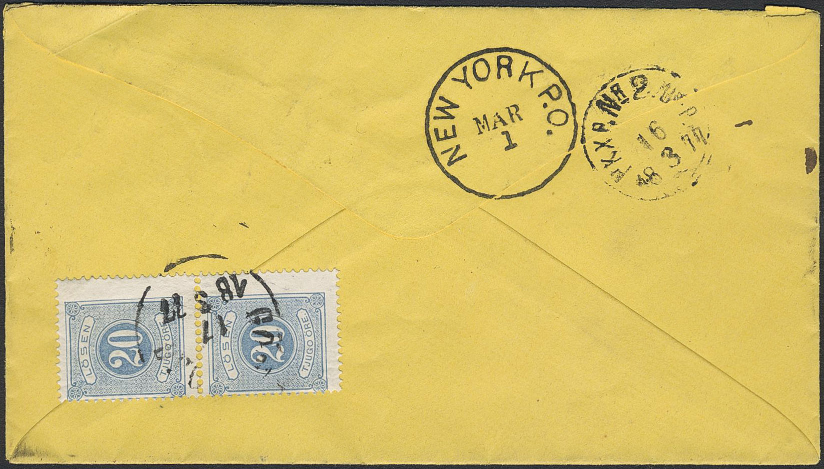 Sweden. Postage due Facit L6 on cover, 2×20 öre (pair) as postage due on unpaid cover sent from USA to GÖTEBORG 17.3.1877.