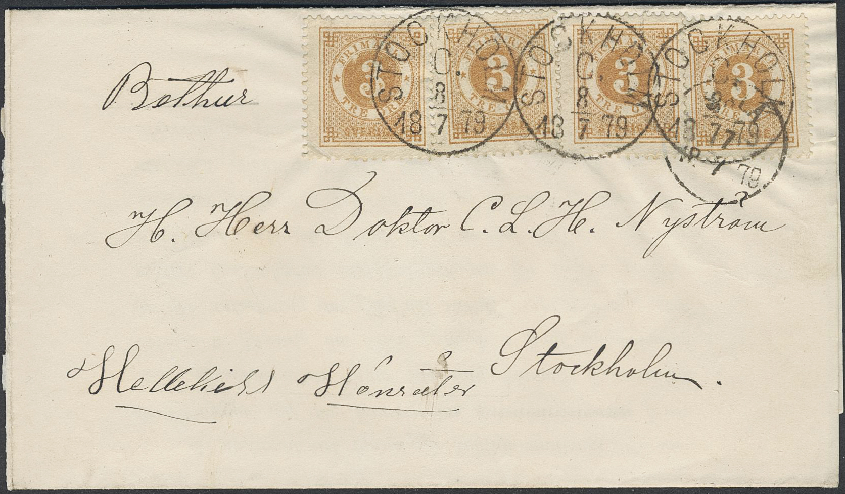 Sweden. Facit 28 on cover, 3 öre on local cover cancelled SALA 7.7.1879, then additionally franked with 3×3 öre and forwarded to STOCKHOLM C 8.7.1879.