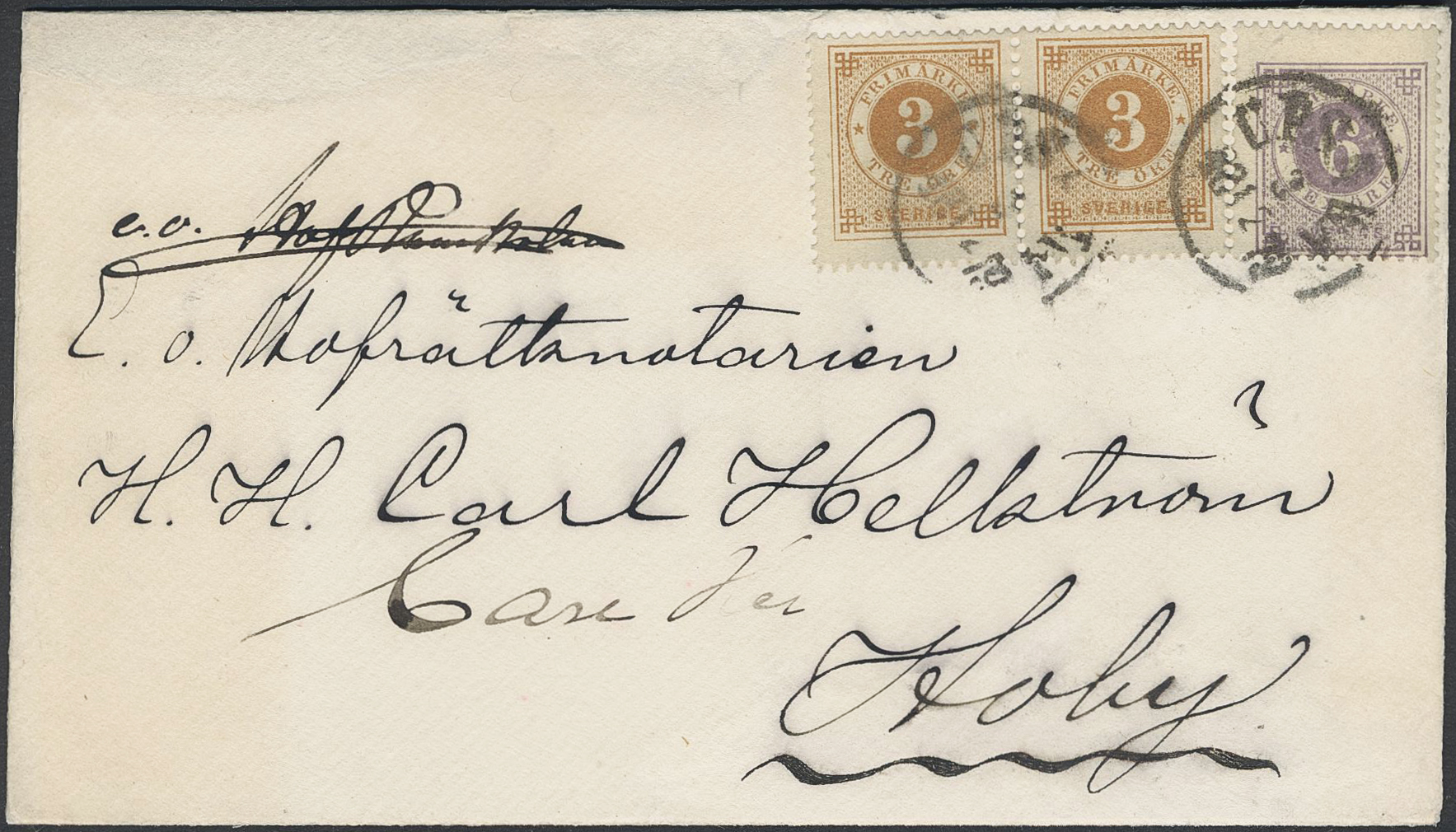 Sweden. Facit 28, 31 on cover, 2×3+6 öre as scarce combination on cover sent from UPSALA 3.12.1879 to Hoby.
