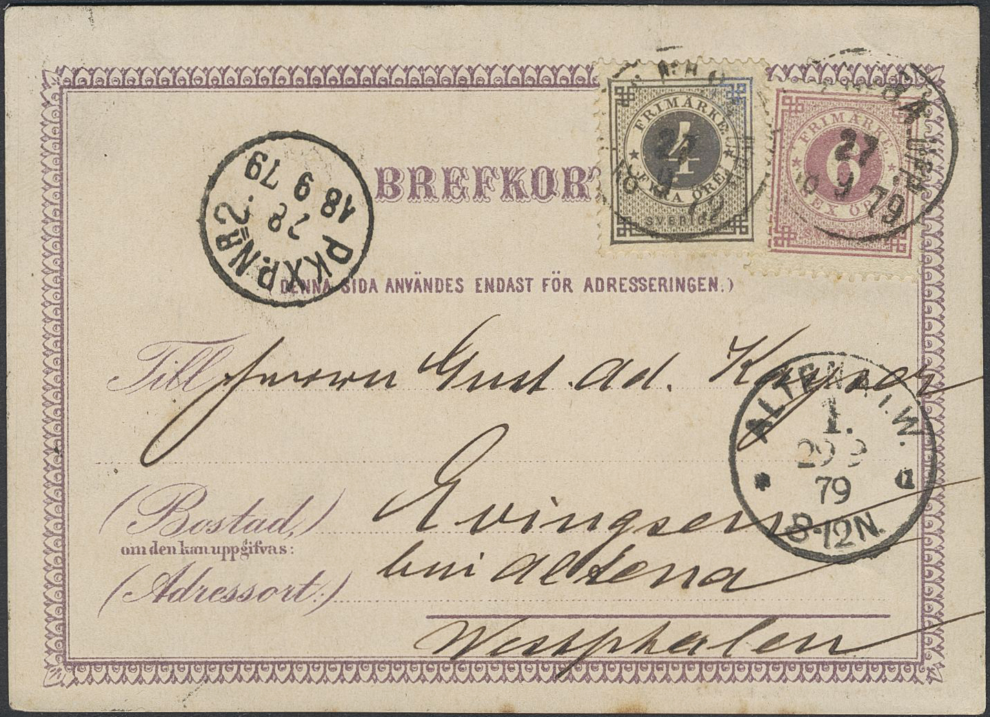 Sweden. Facit 29, 31 on cover, 4+6 öre on particularly beautiful and early postcard sent from PKXP Nr 8A UPP 27.9.1879 to Germany. Privately manufactured postcards were not allowed abroad until 1.4.1886. Scarce item.