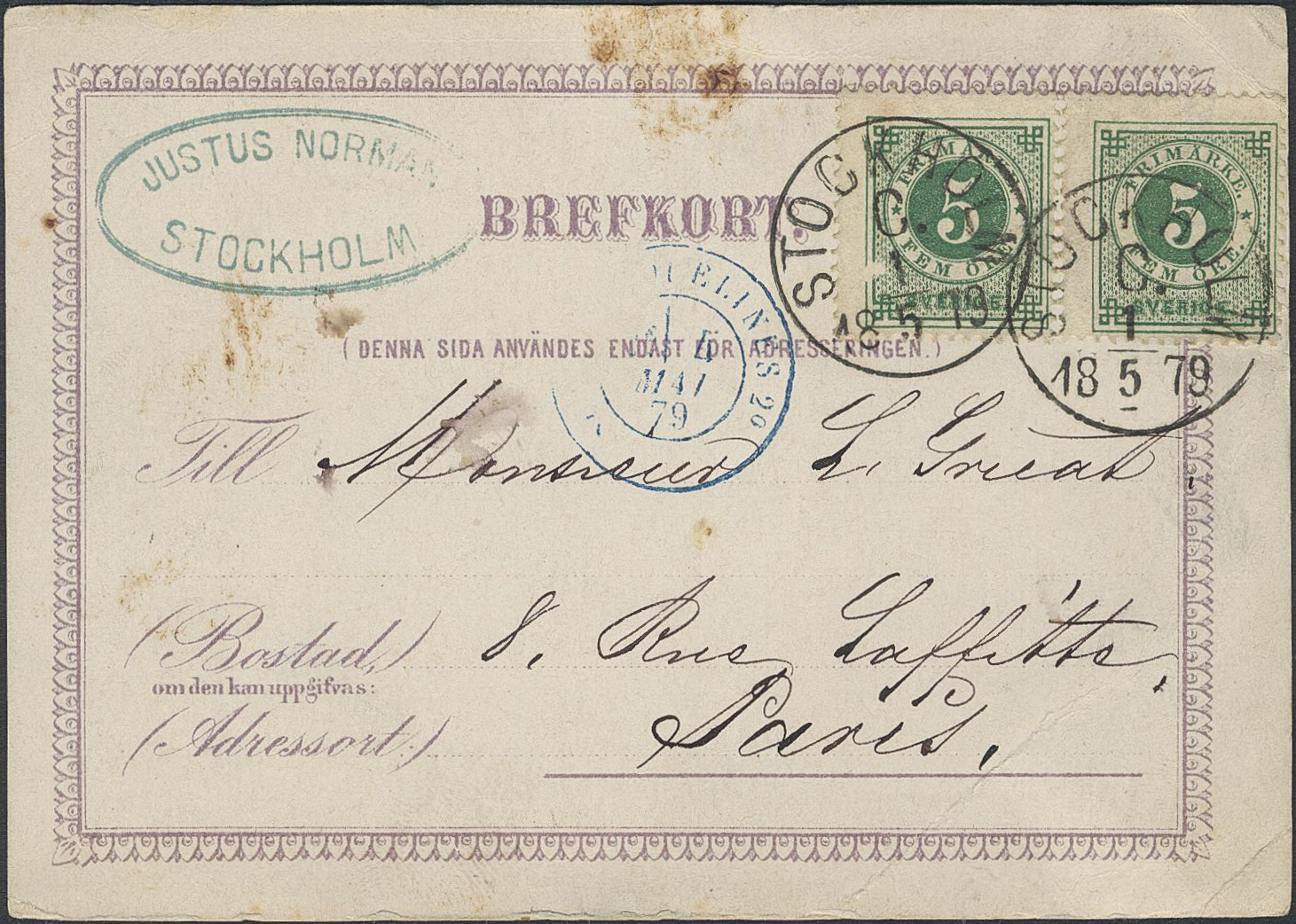 Sweden. Facit 30 on cover, 2×5 öre on early postcard sent from STOCKHOLM C 1.5.1879 to France, with arrival pmk SUEDE-ERQUELINES 4.MAI.79. Privately manufactured postcards were not allowed abroad until 1.4.1886. Scarce item.