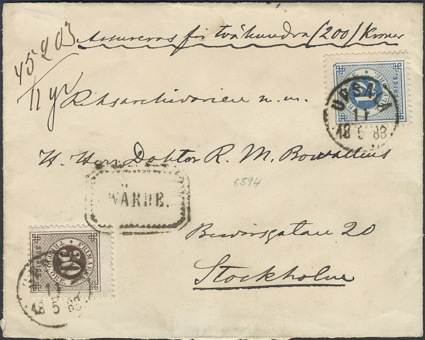 Sweden. Facit 32, 35 on cover, 12+30 öre on insured cover sent from UPSALA 11.5.1883 to Stockholm.
