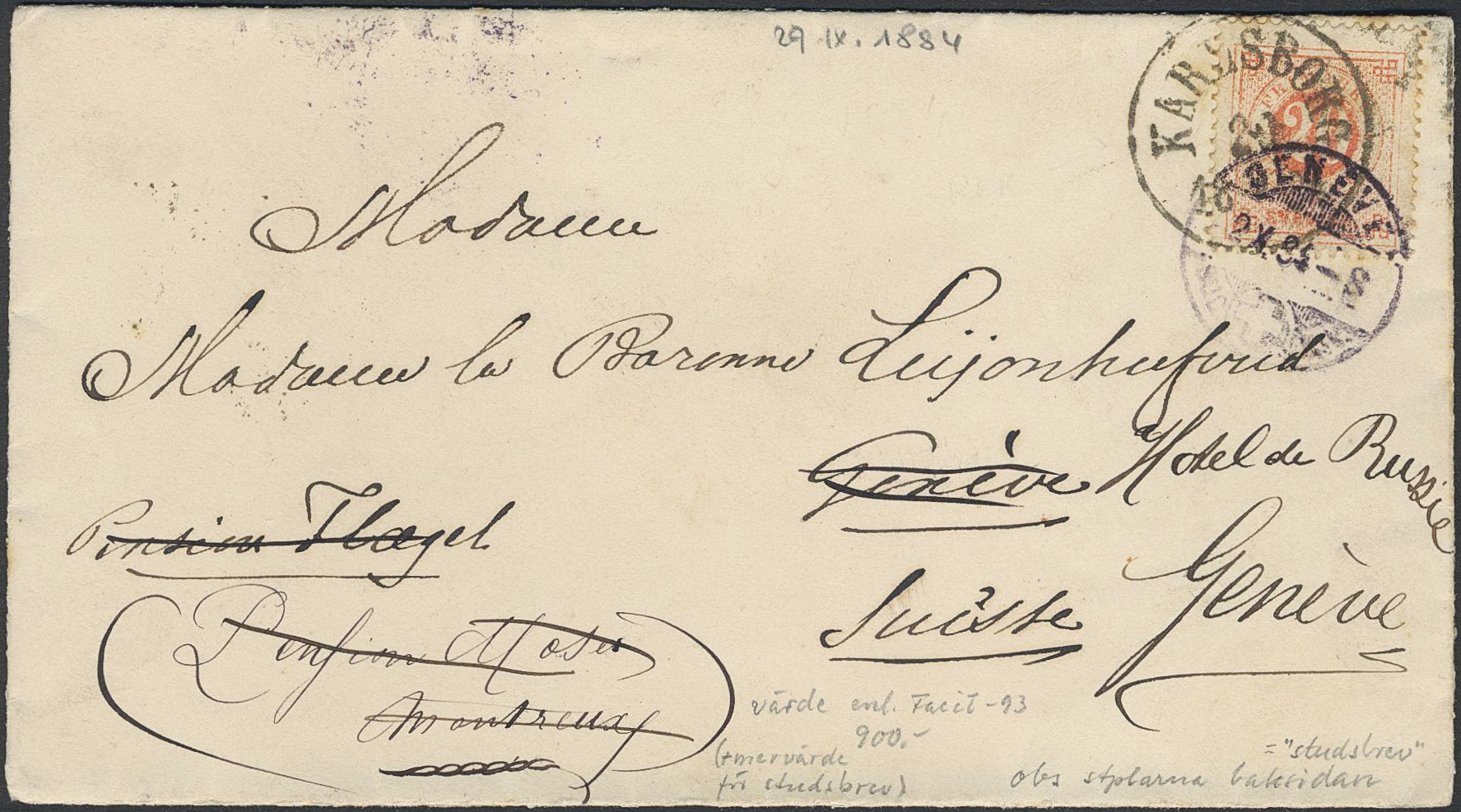 Sweden. Facit 33 on cover, 20 öre on cover sent from KARLSBORG 29.9.1884 via PKXP No 2 B UTR N 30.9.1884 to Switzerland. Forwarded with several Swizz postmarks.