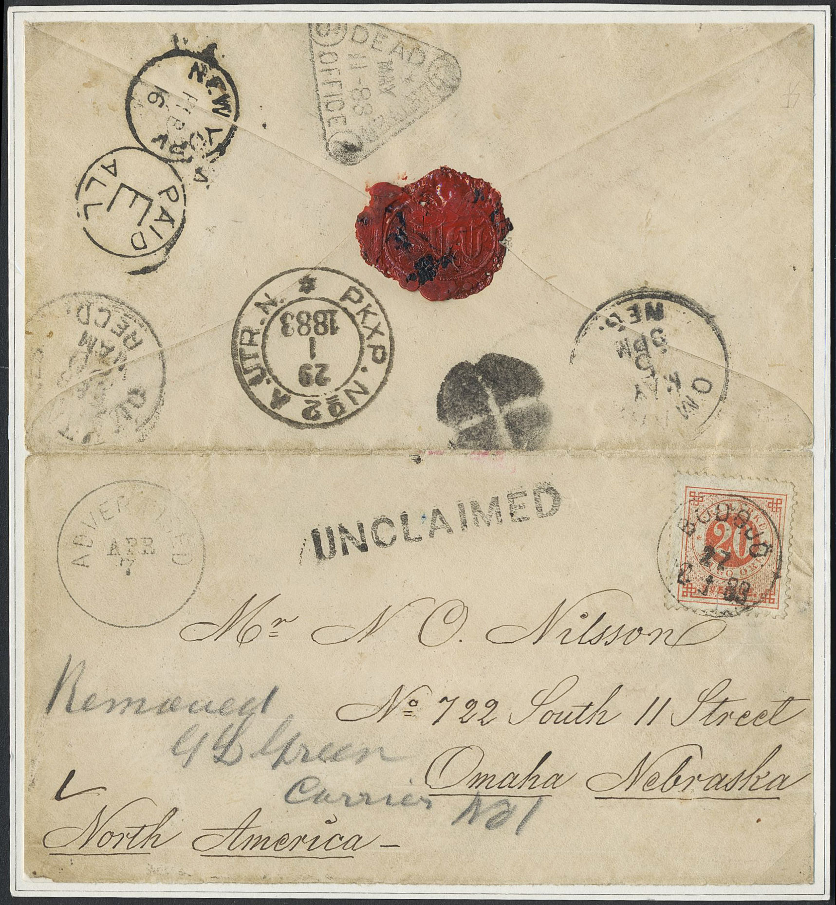 Sweden. Facit 33 on cover, 20 öre on cover sent from BODSJÖ 27.1.1883 to USA. Undeliverable with marks UNCLAIMED and DEAD LETTER OFFICE 11.MAY.83.