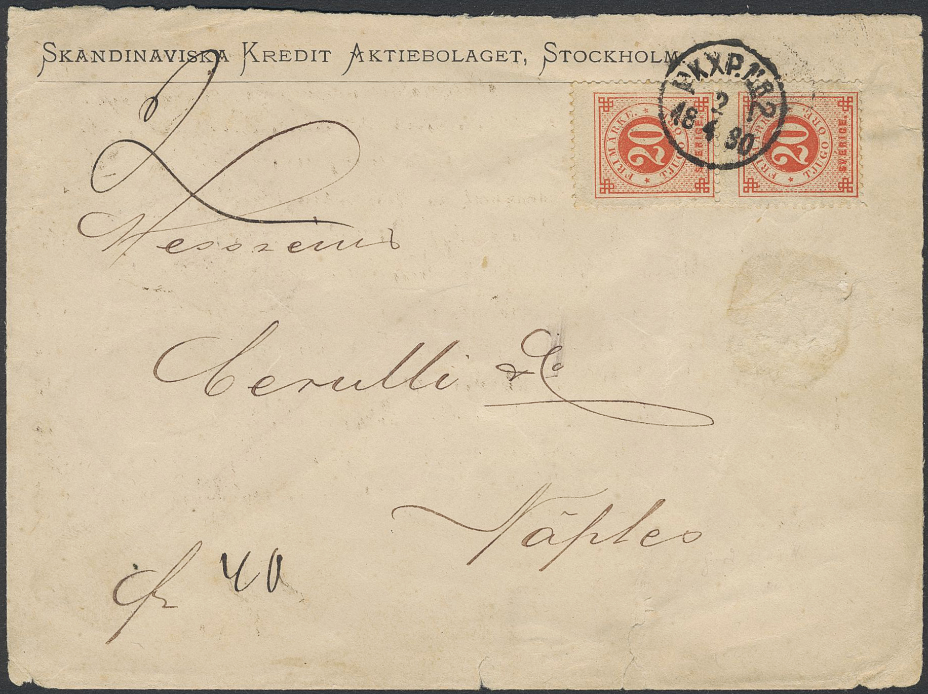Sweden. Facit 33 on cover, 2×20 öre on double rate cover sent from PKXP Nr 2 2.4.1890 to Italy, with arrival pmks on the reverse. Front with tiny hole.
