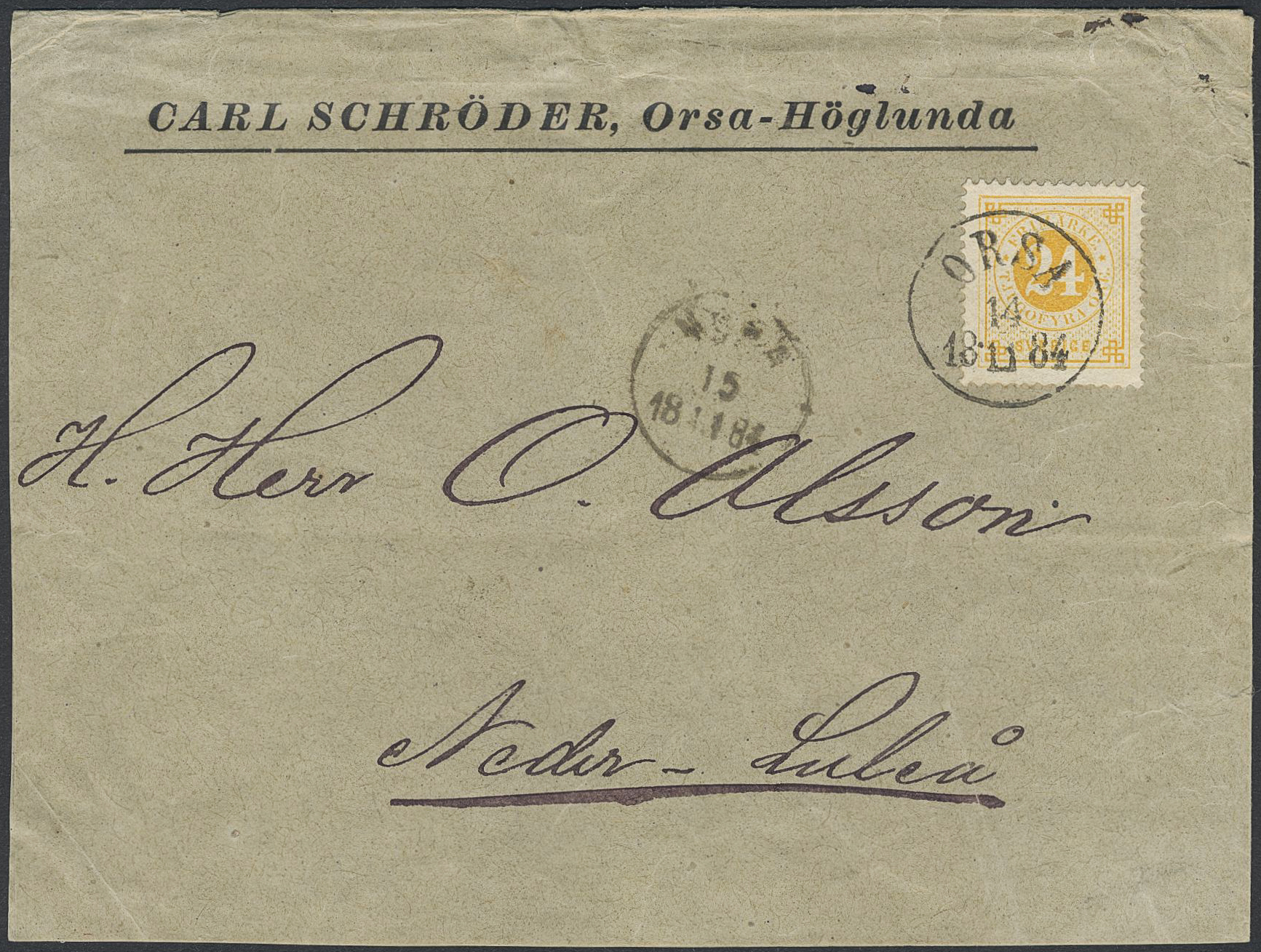 Sweden. Facit 34 on cover, 24 öre very beautiful double rate cover sent from ORSA 14.11.1884 to Nederluleå.