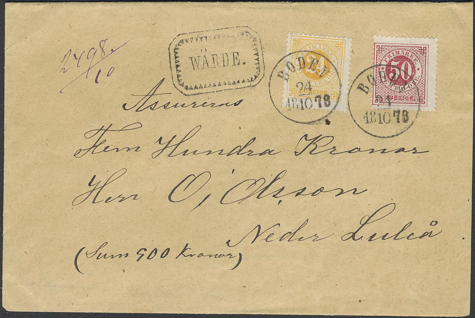 Sweden. Facit 34b, 36a on cover, Very fresh insured cover with 24 öre (short perf) and 50 öre = 74 öre. Sent from BODEN 24.10.78 to Neder Luleå. Cert. Nils Svensson superb.