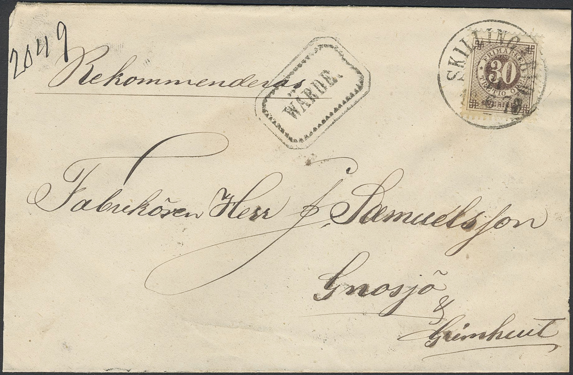 Sweden. Facit 35 on cover, 30 öre on very beautiful registered cover sent from SKILLINGARYD 21.6.1878 via JÖNKÖPING 21.6.1878 to Gnosjö. Superb–EXCELLENT.