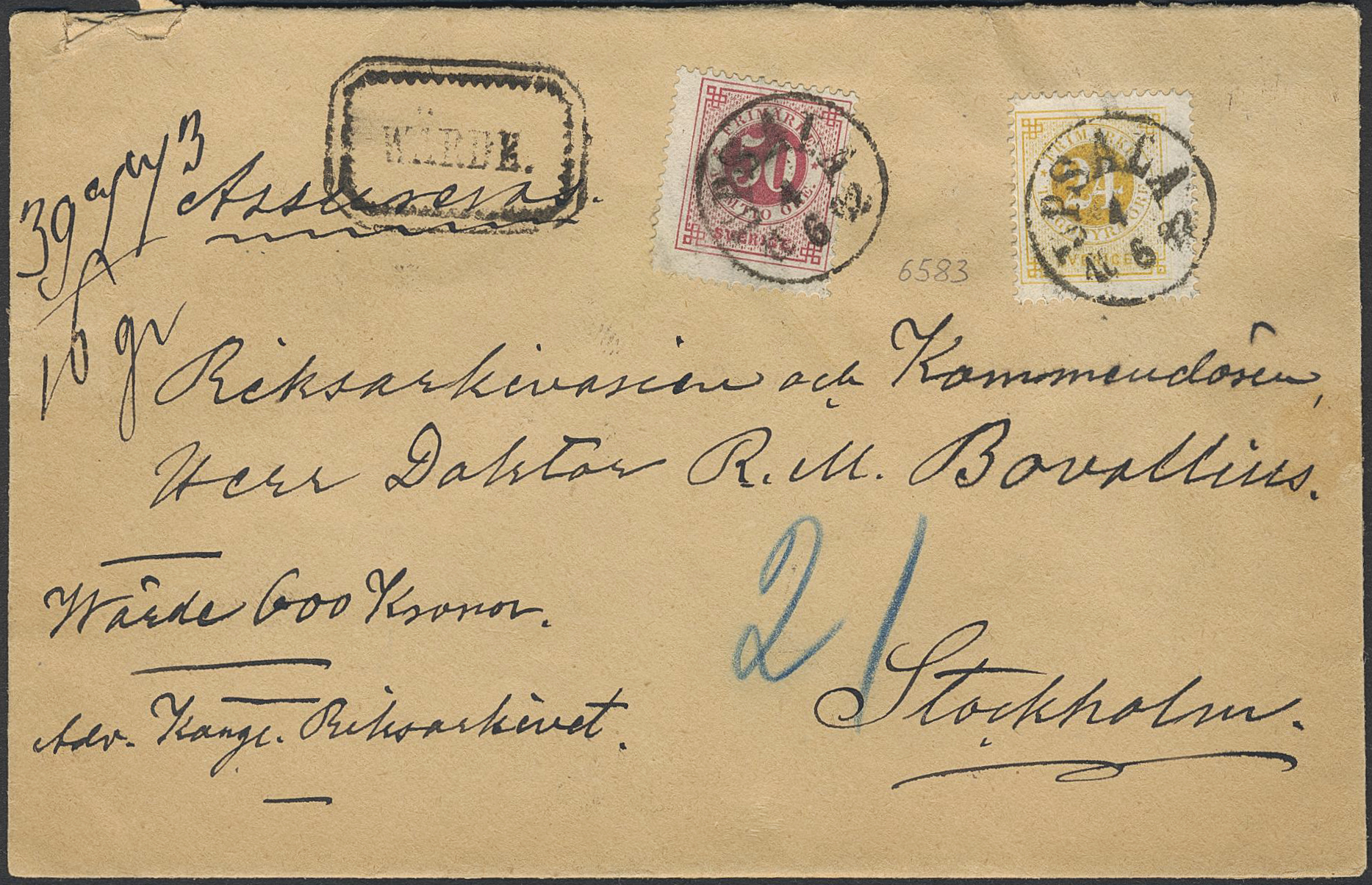 Sweden. Facit 36, 34 on cover, 24+50 öre on insured cover sent from UPSALA 4.6.1882 to Stockholm.