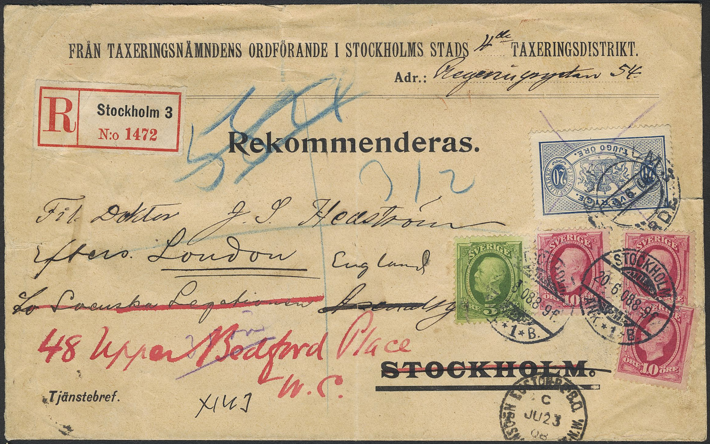 Sweden. Official Facit Tj19 on cover, 20 öre on local registered cover cancelled STOCKHOLM 3 19.6.08, then forwarded to Great Britain with new franking (F52, 54) with several arrival pmks on the reverse.