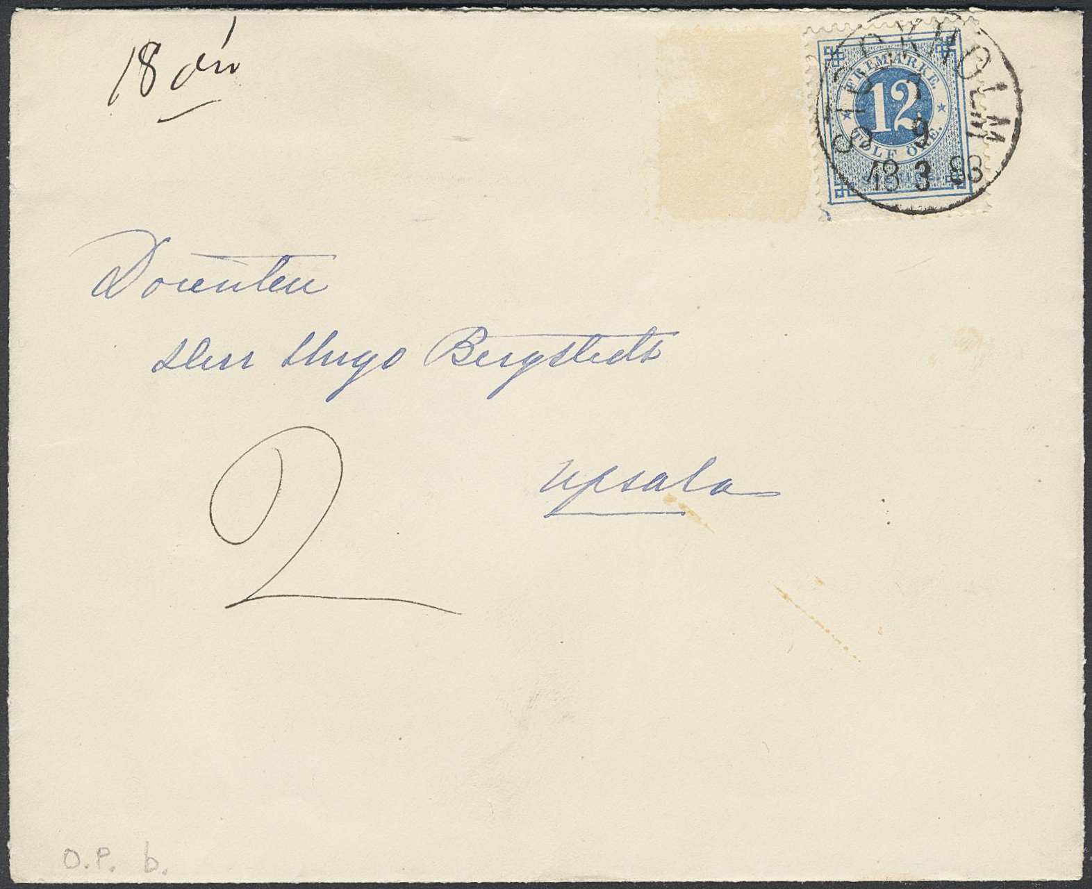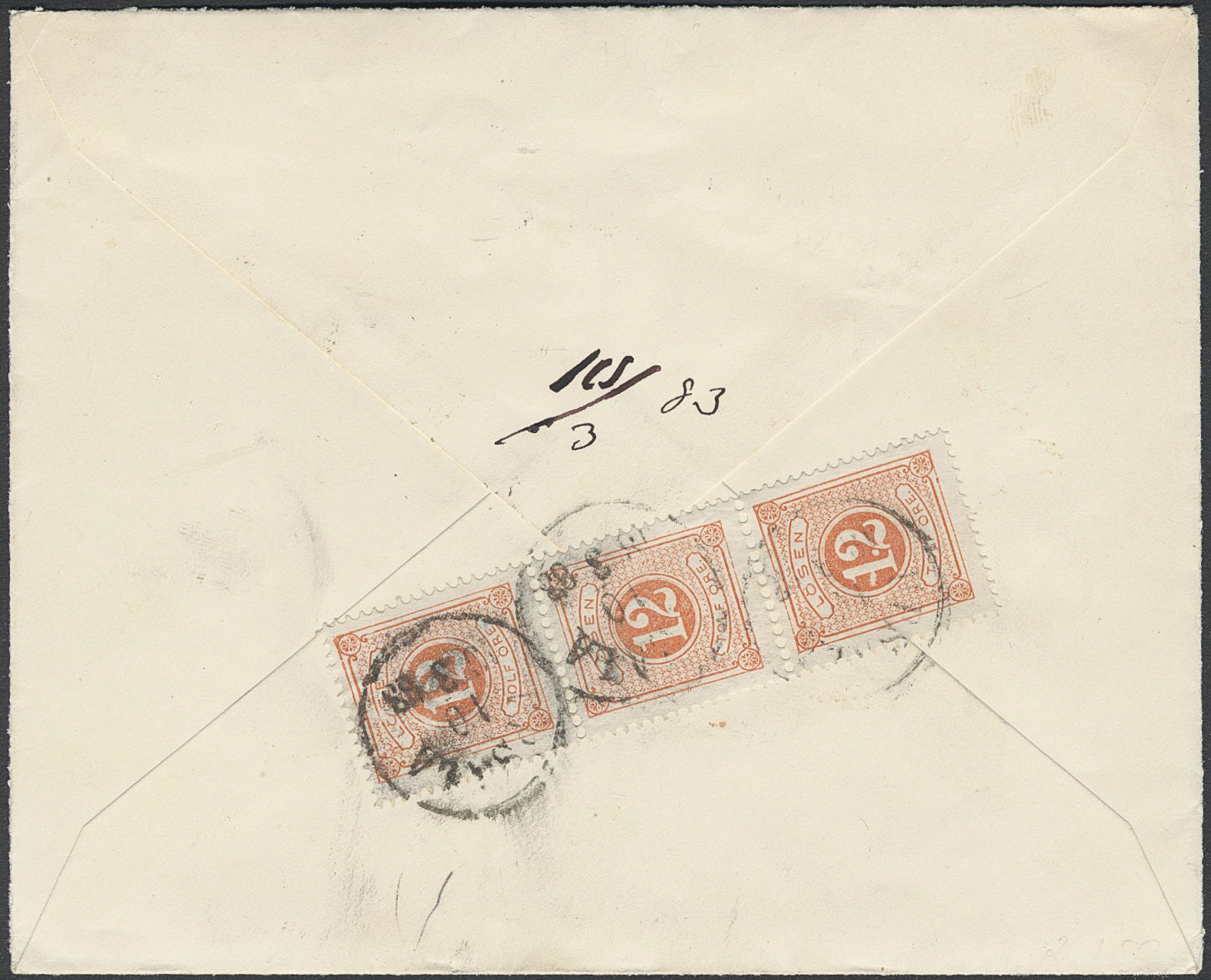 Sweden. Postage due Facit L15, F32b on cover, 3×12 öre in strip of three as postage due on insufficiently prepaid 2-fold cover sent from STOCKHOLM 9.3.1888 to Uppsala.