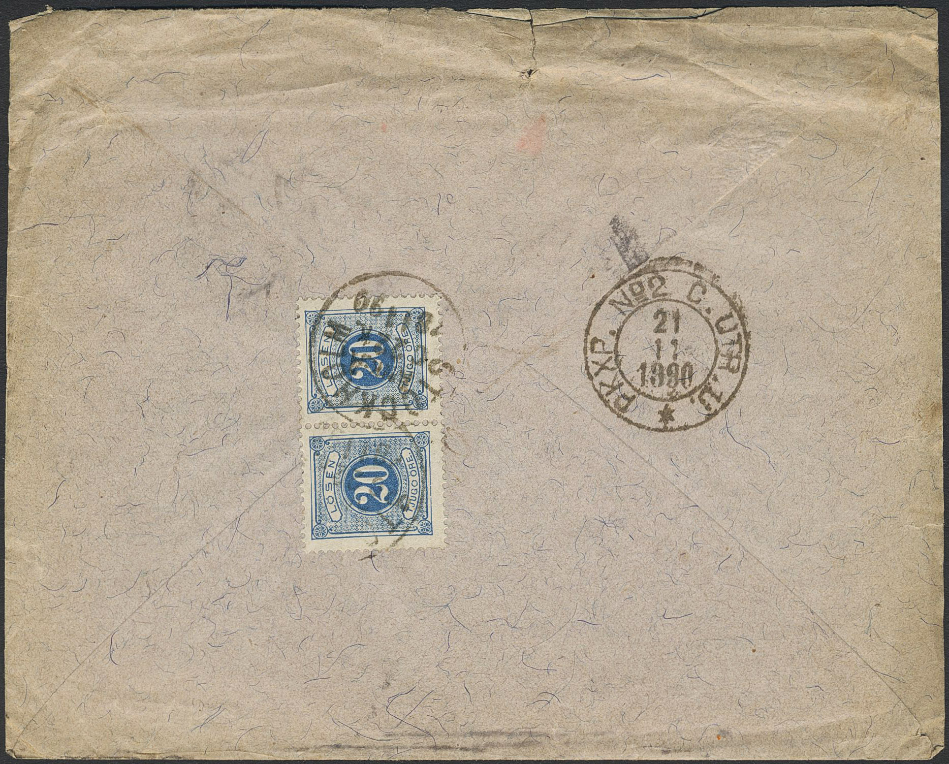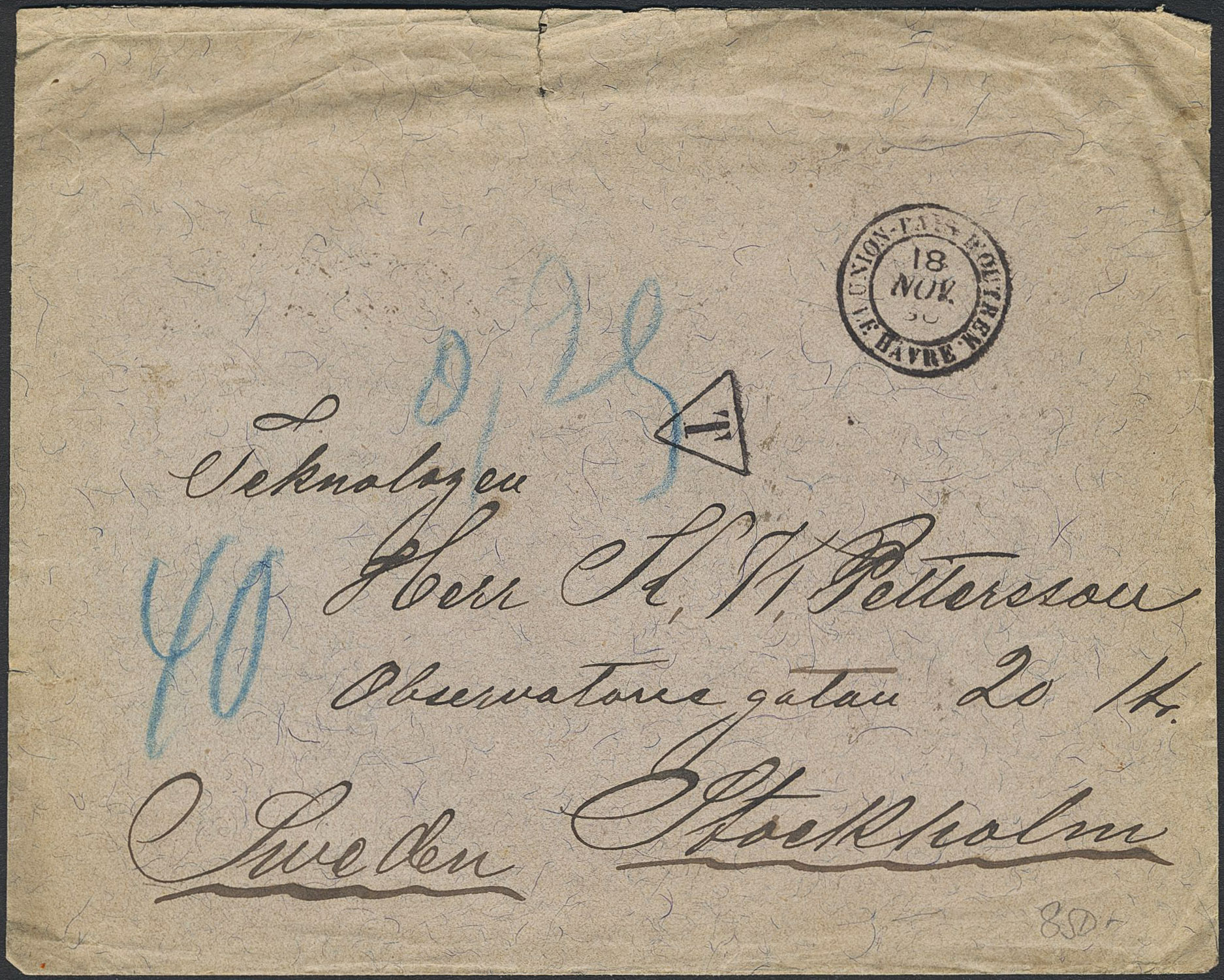 Sweden. Postage due Facit L16 on cover, 2×20 öre (pair) as postage due on unpaid cover sent from France to STOCKHOLM ANK A 22.11.1890.