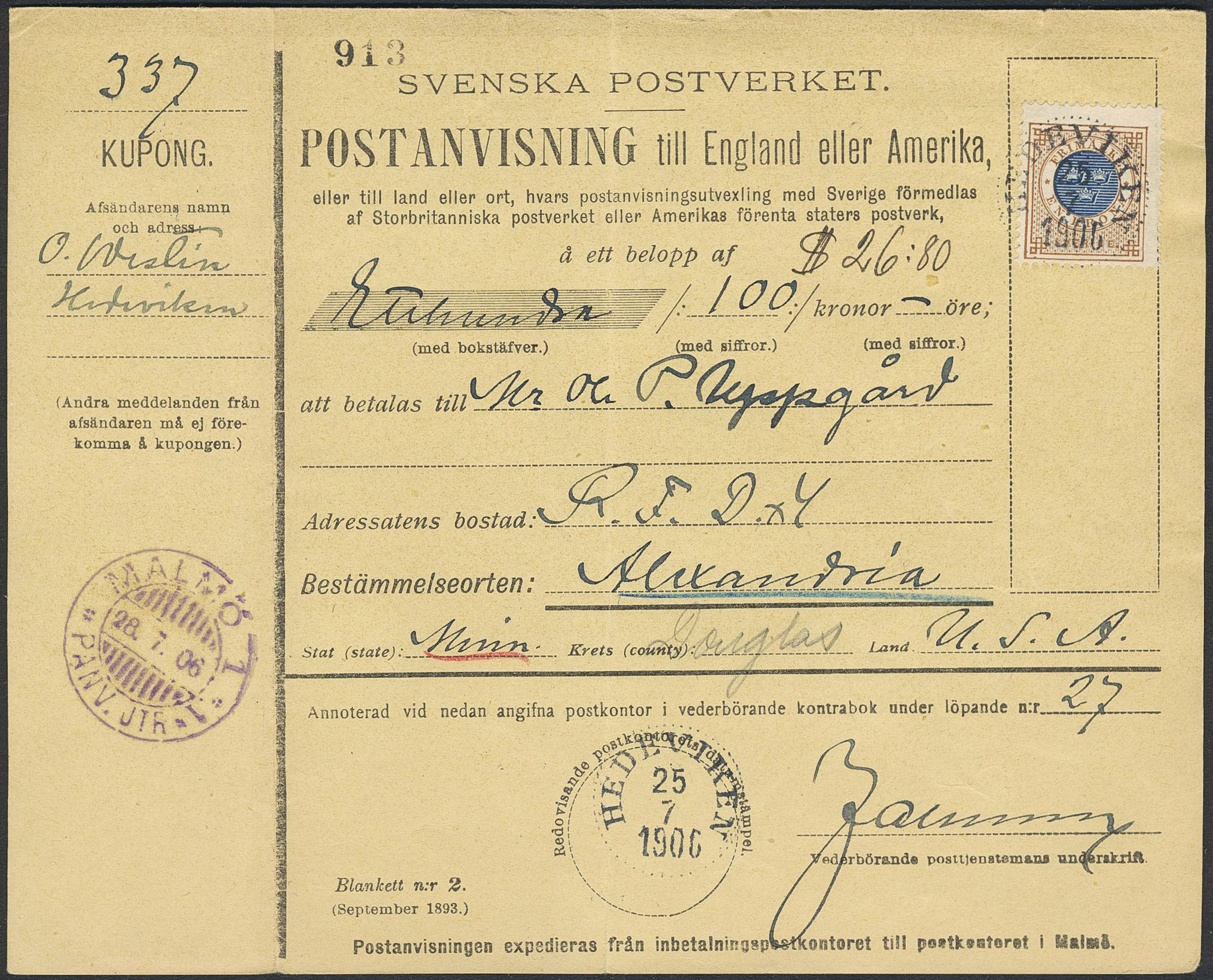 Sweden. Facit 49 on cover, 1 kr on beautiful list money order sent from HEDEVIKEN 25.7.1906 to Alexandria, USA.