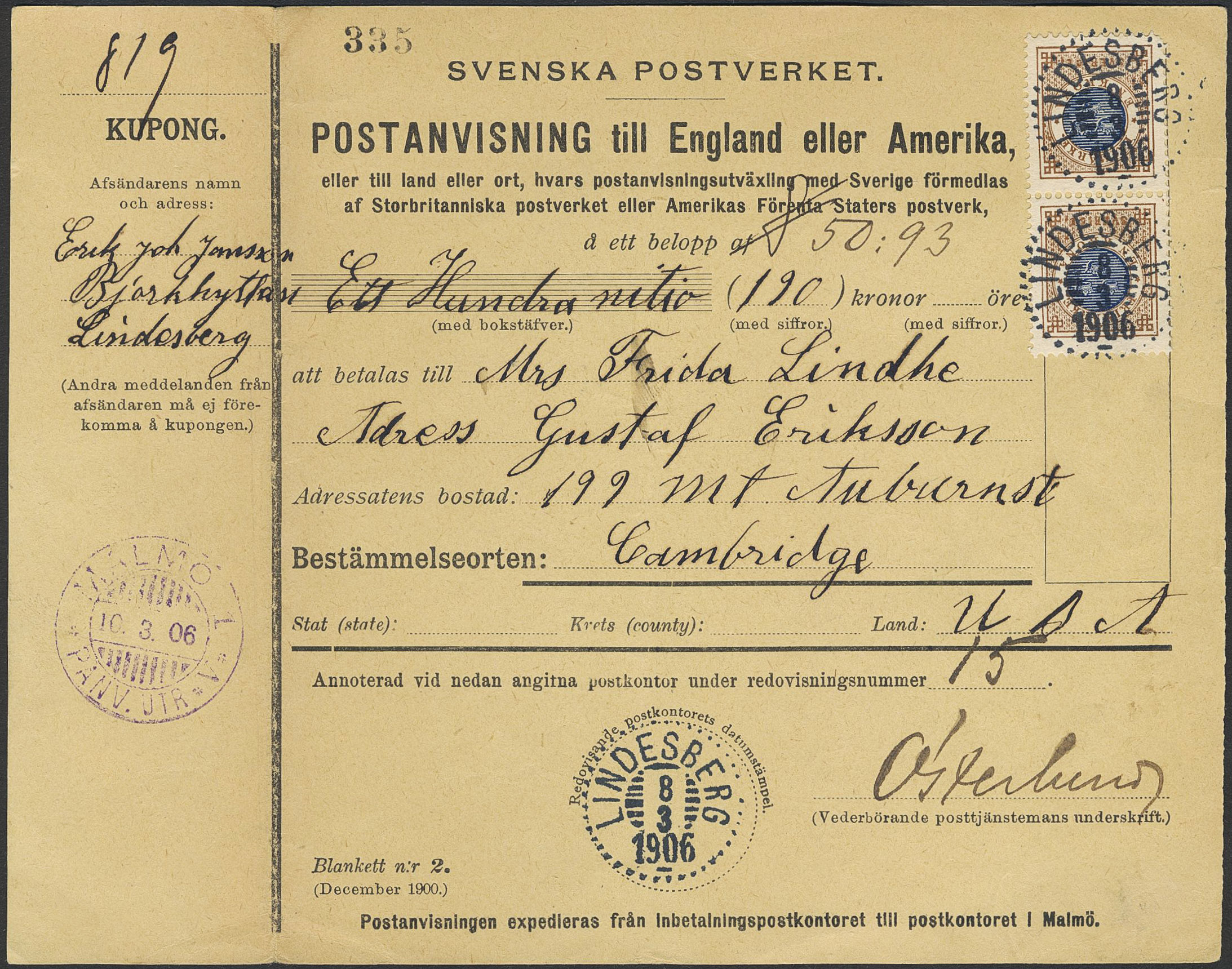 Sweden. Facit 49 on cover, 2×1 kr (pair) on very beautiful list money order sent from LINDESBERG 8.3.1906 to USA.