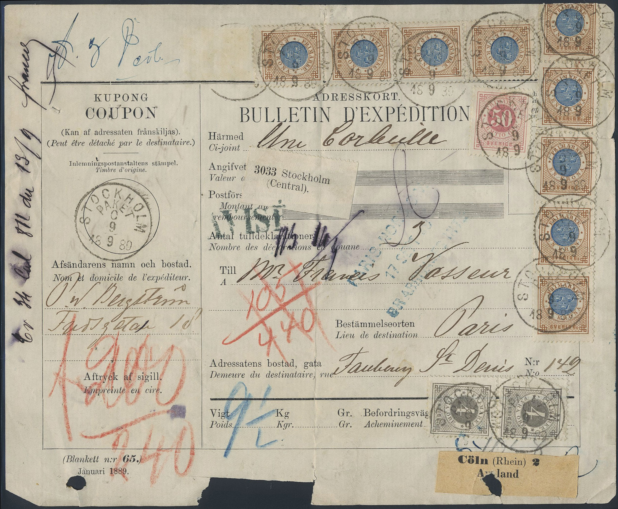 Sweden. Facit 49, 42, 48 on cover, 2×4+50 öre + 9×1 kr (one stamp missing) on address card for parcel sent from STOCKHOLM PAKET 9.9.1889 via STRALSUND 11.9.89 and CÖLN 12.9.89 to France. The form with small paper losses.